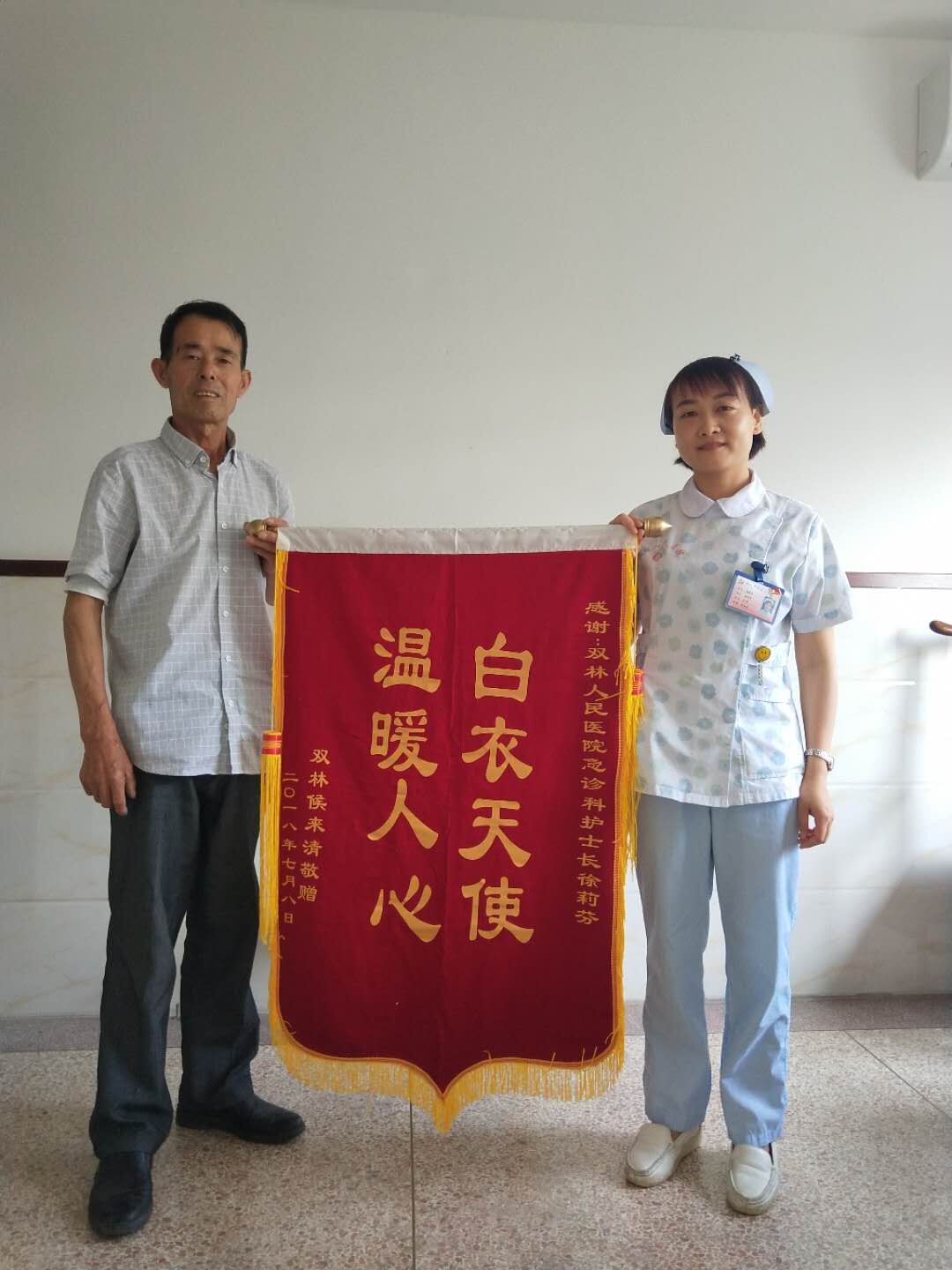7月9日下午,双林人民医院三楼的PICC门诊出现感人一幕,患者候来清双手捧着一面红彤彤的锦旗来到护士徐莉芬面前,一定要表达谢意,这是徐莉芬收到的第二面锦旗。