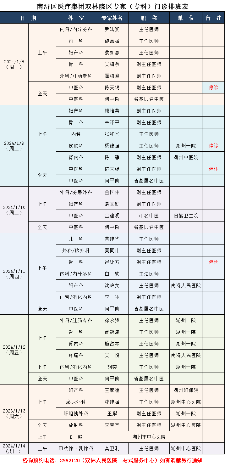 双林人民医院专家排班1.8-1.14