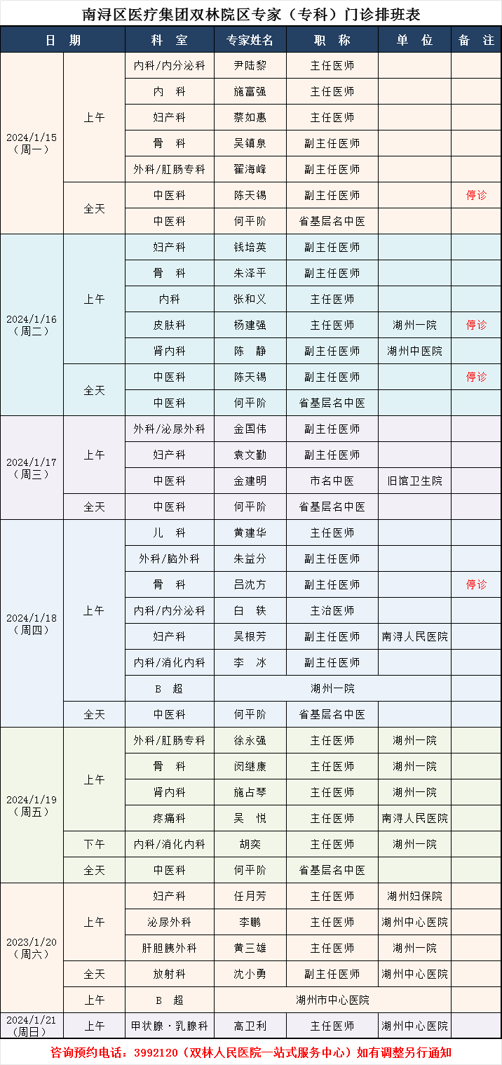 双林人民医院专家排班1.15-1.21
