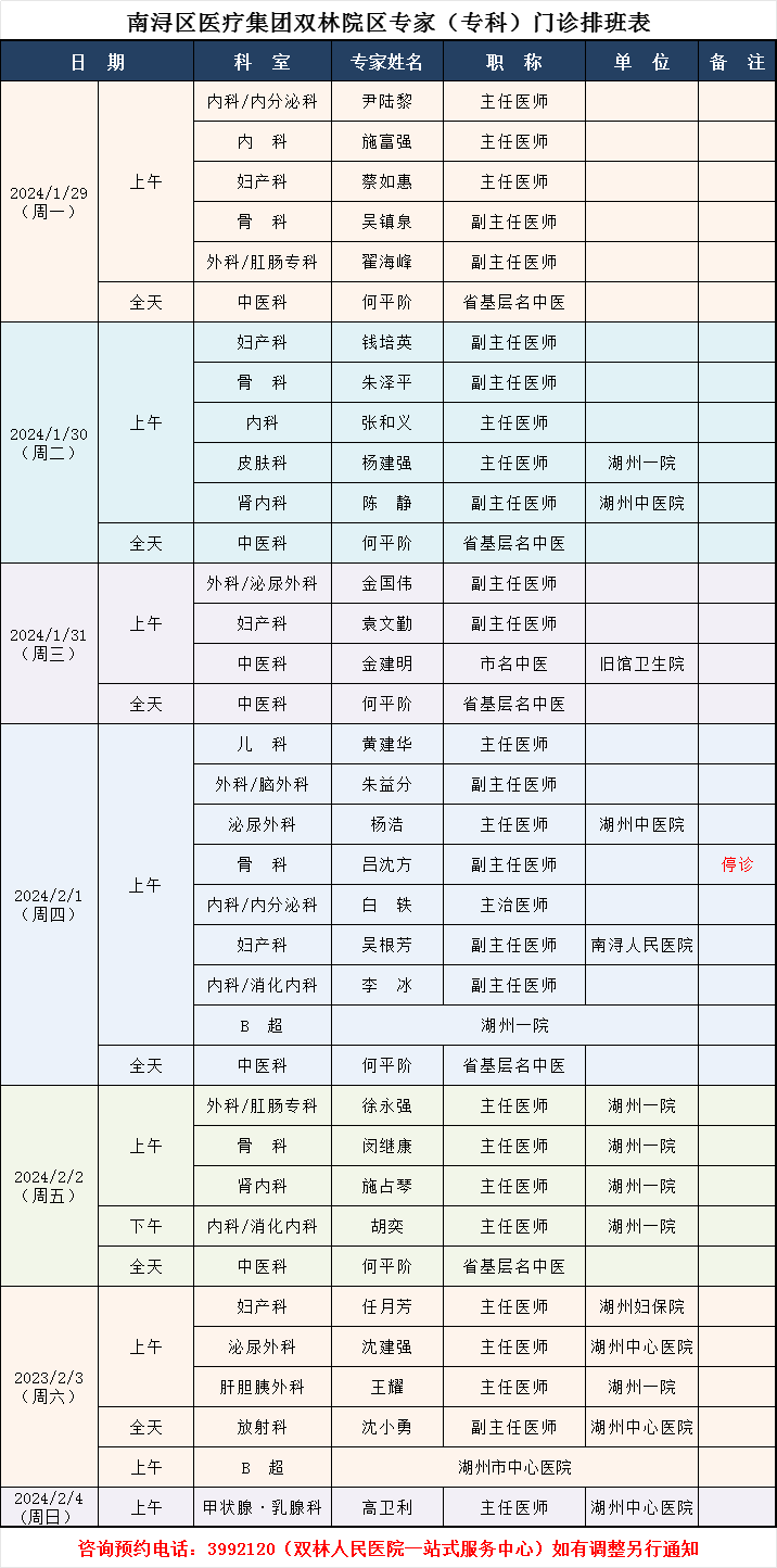 双林人民医院专家排班1.29-2.4