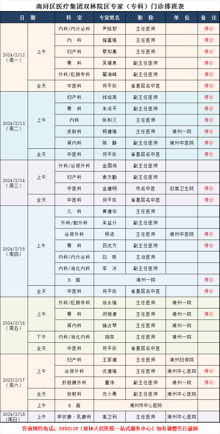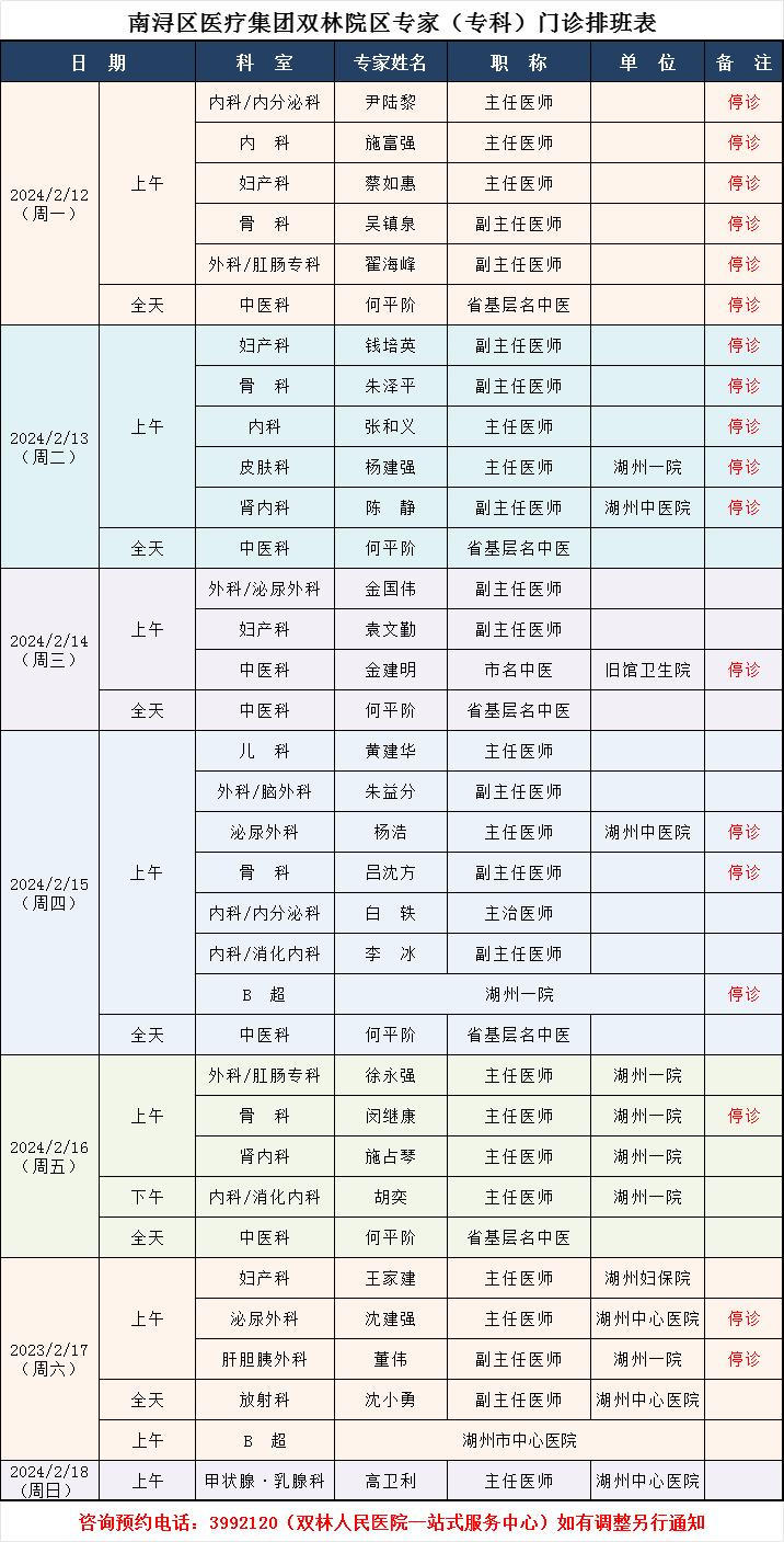 双林人民医院专家排班2.12-2.18