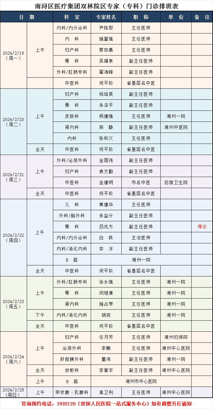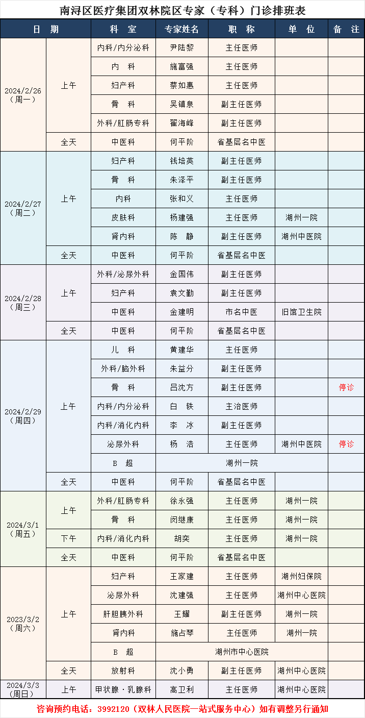 双林人民医院专家排班2.26-3.3