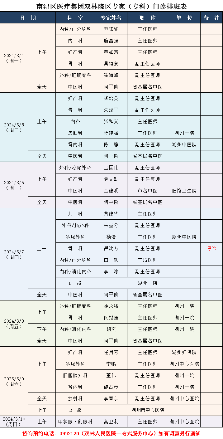 双林人民医院专家排班3.4-3.10