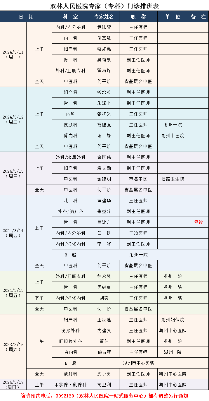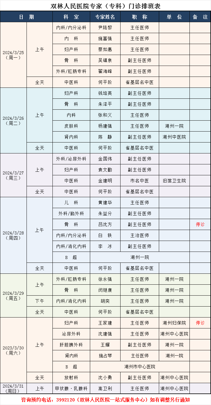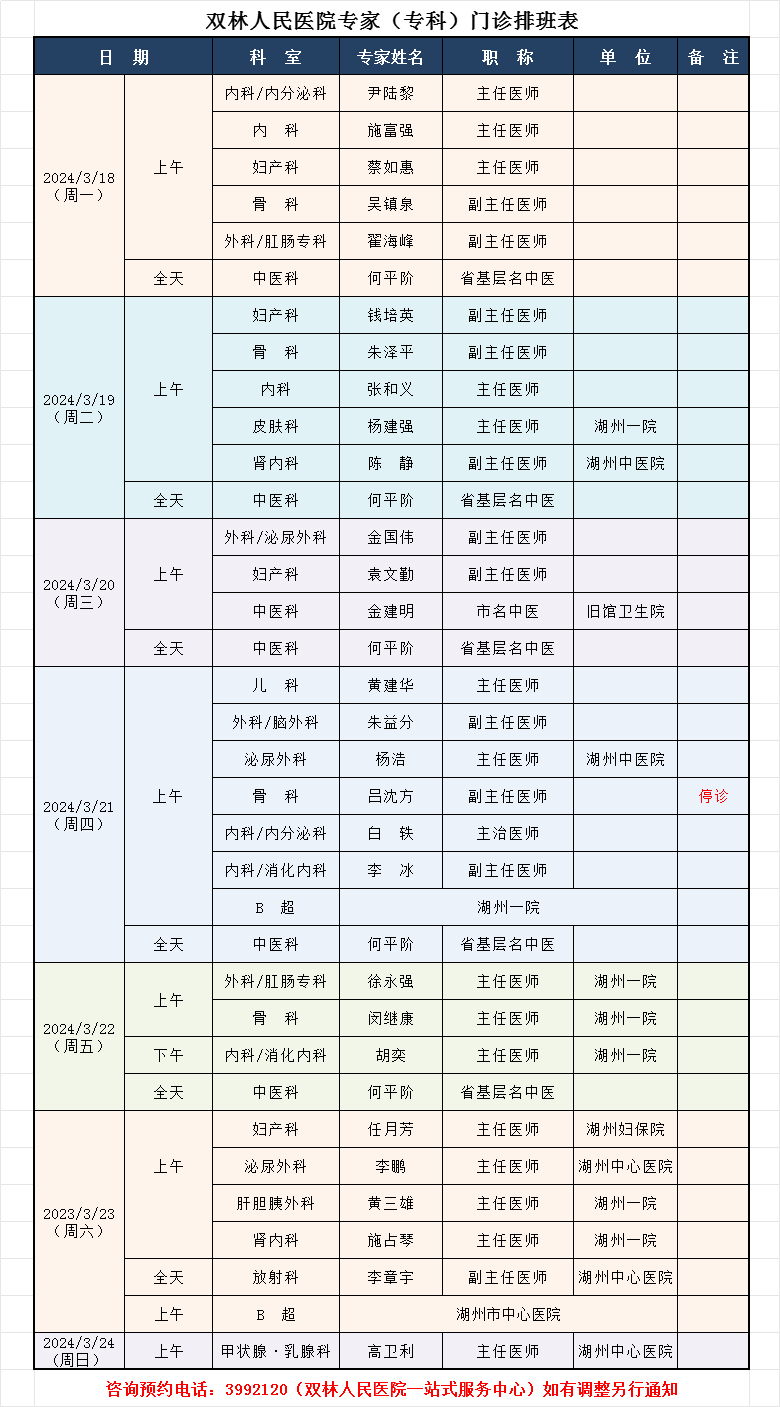 双林人民院区专家排班3.18-3.24