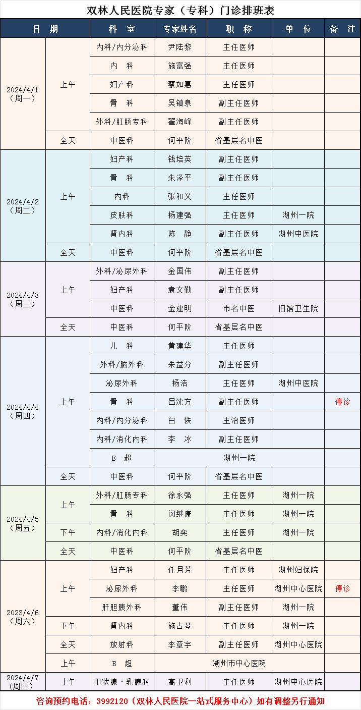 双林人民医院专家排班4.1-4.7