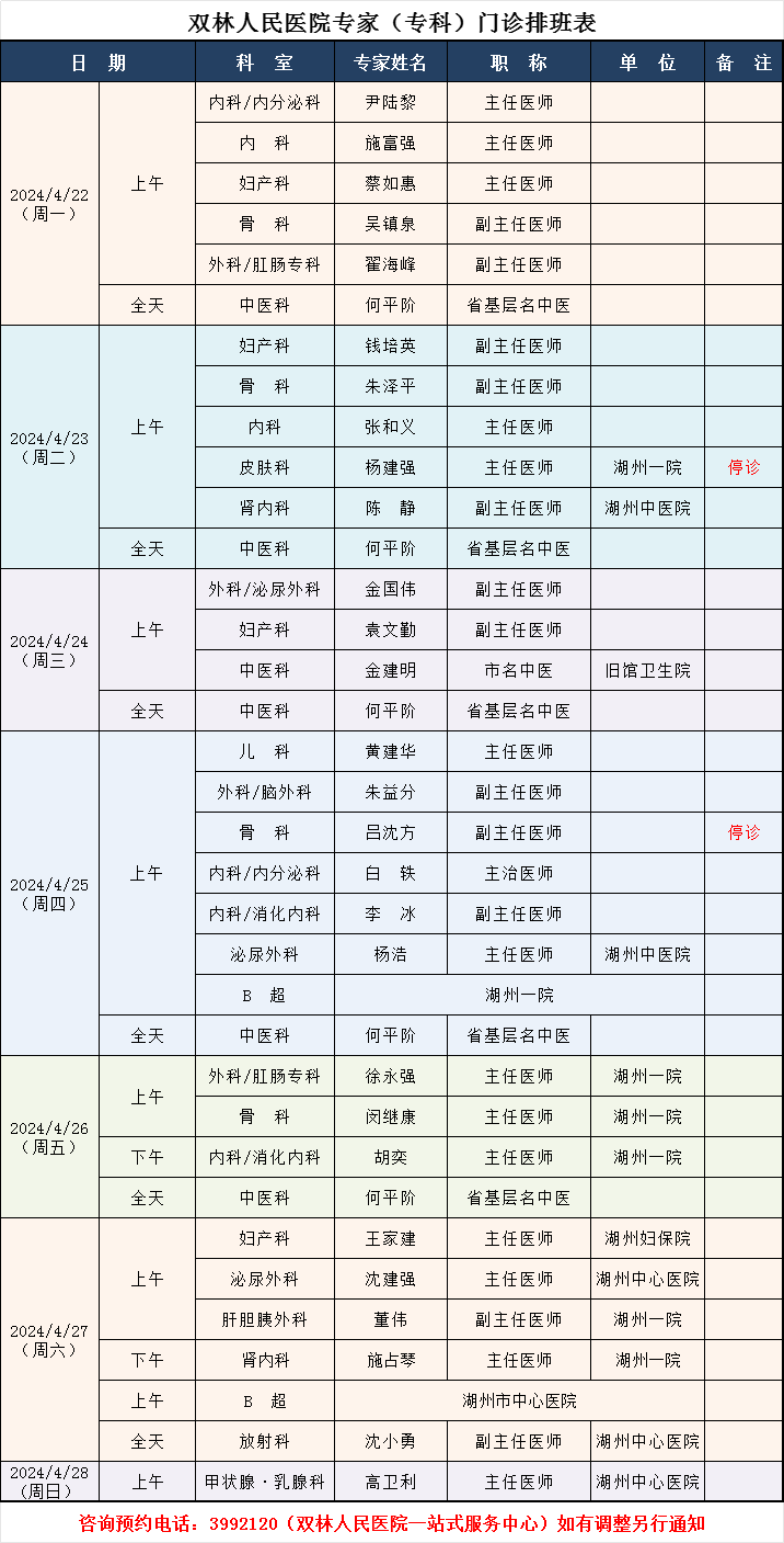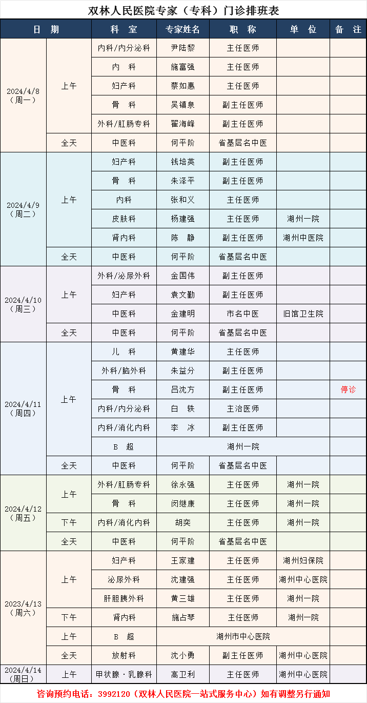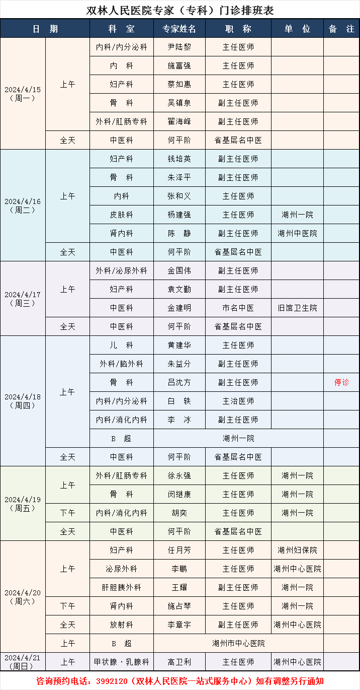 双林人民医院专家排班4.7-4.14