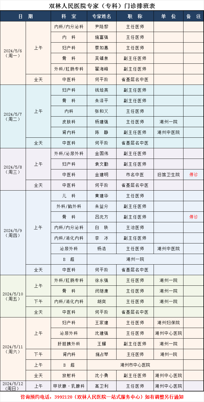 双林人民医院专家排班5.6-5.12