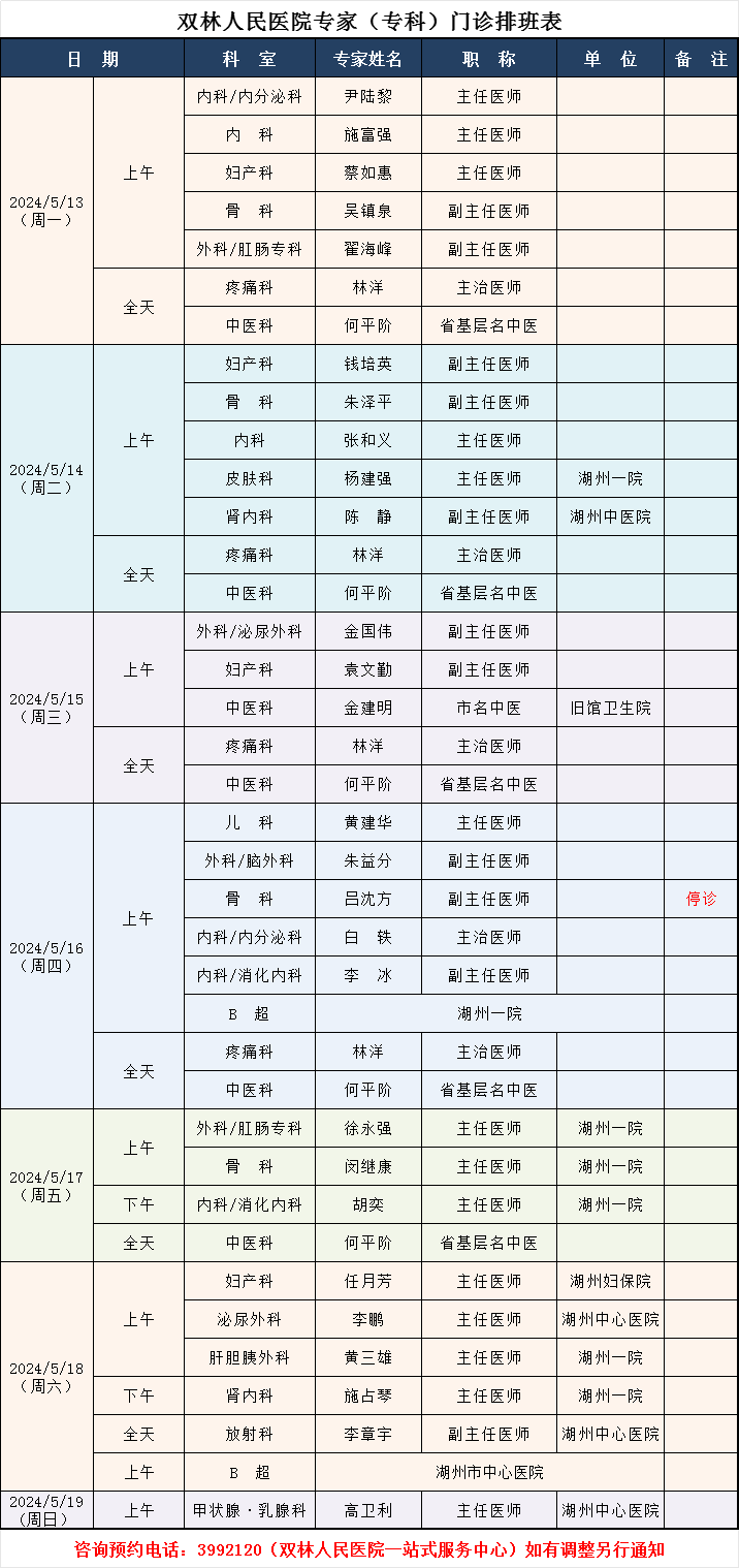 双林人民医院专家排班5.13-5.19