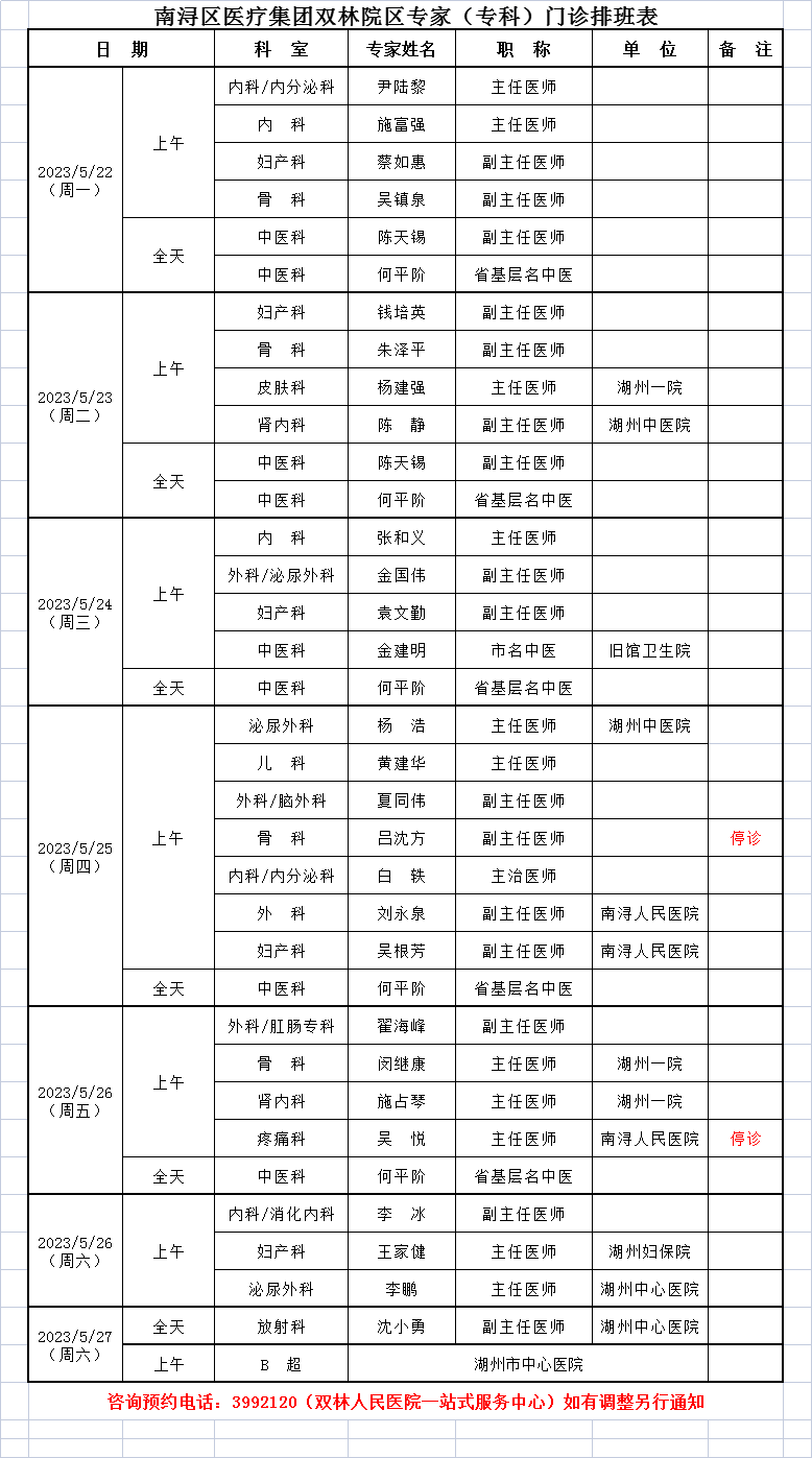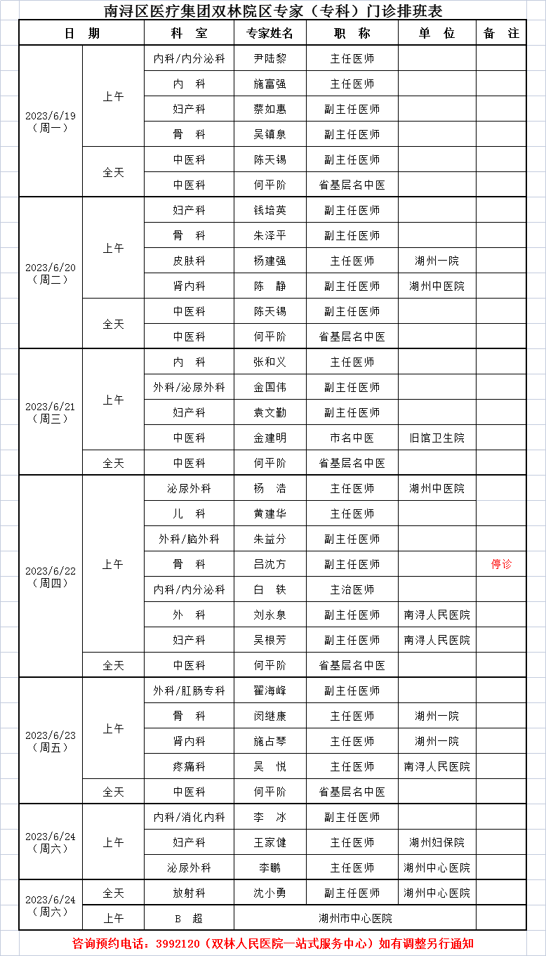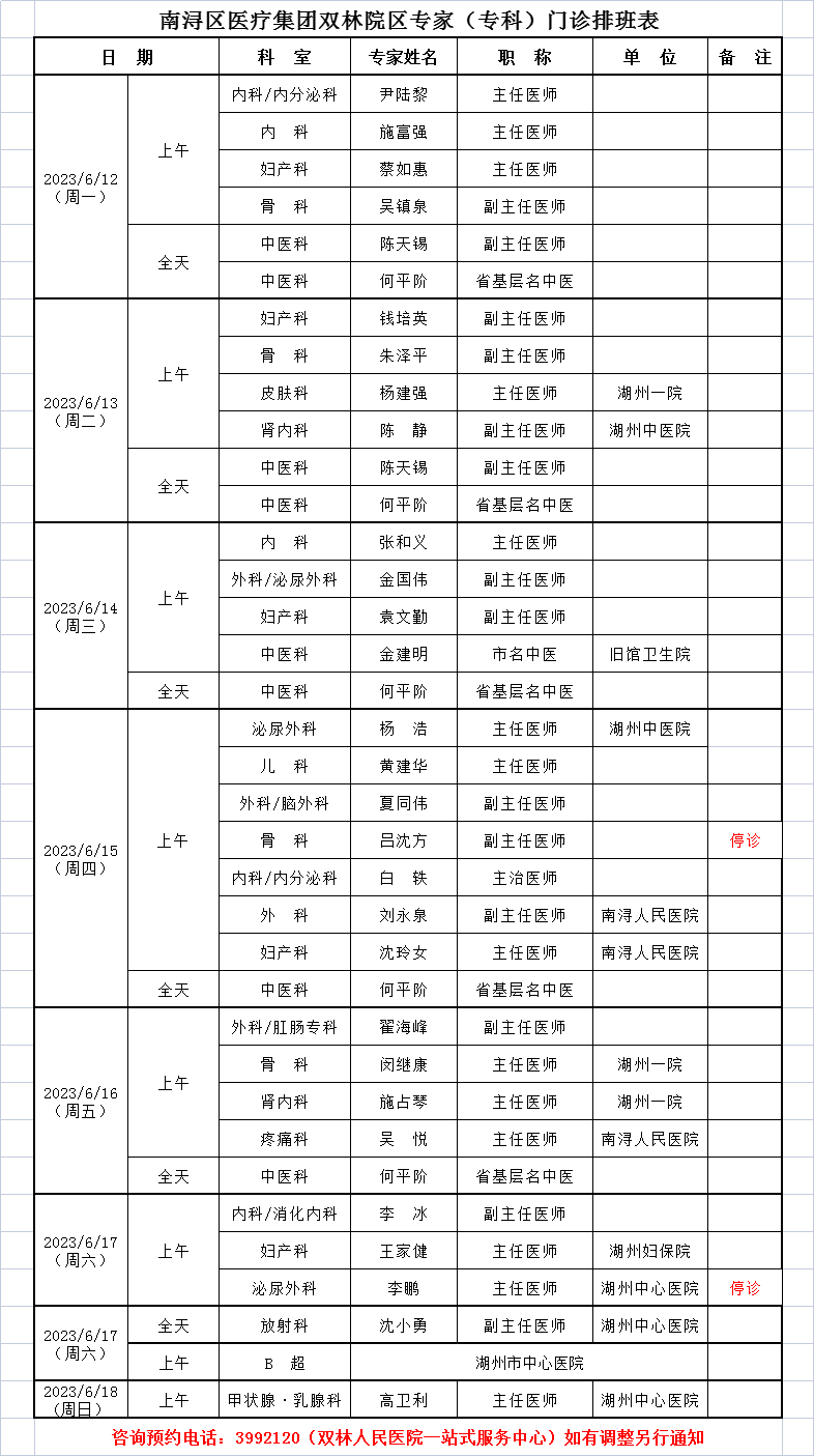 来自:双林人民院区专家排班6.12-6.18