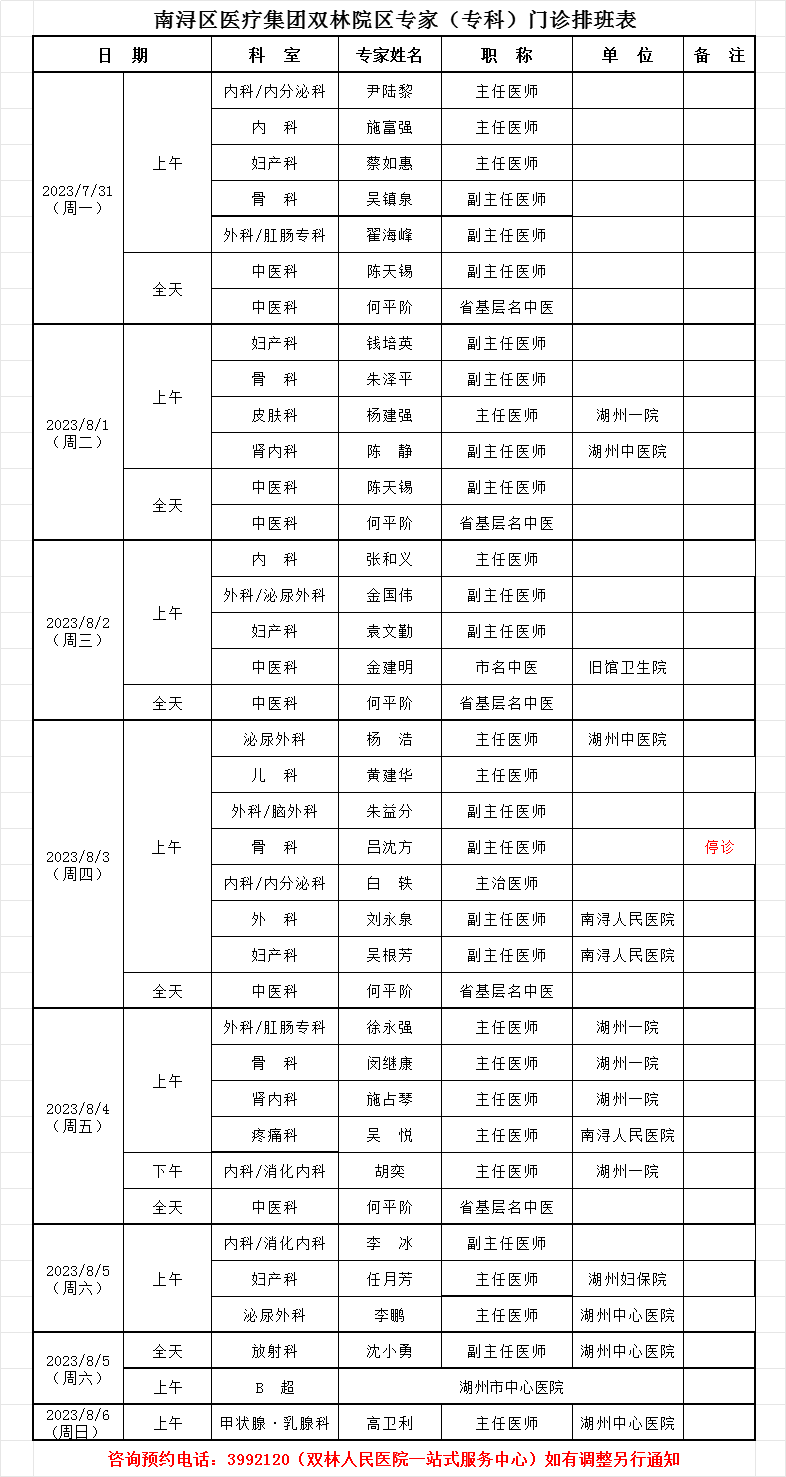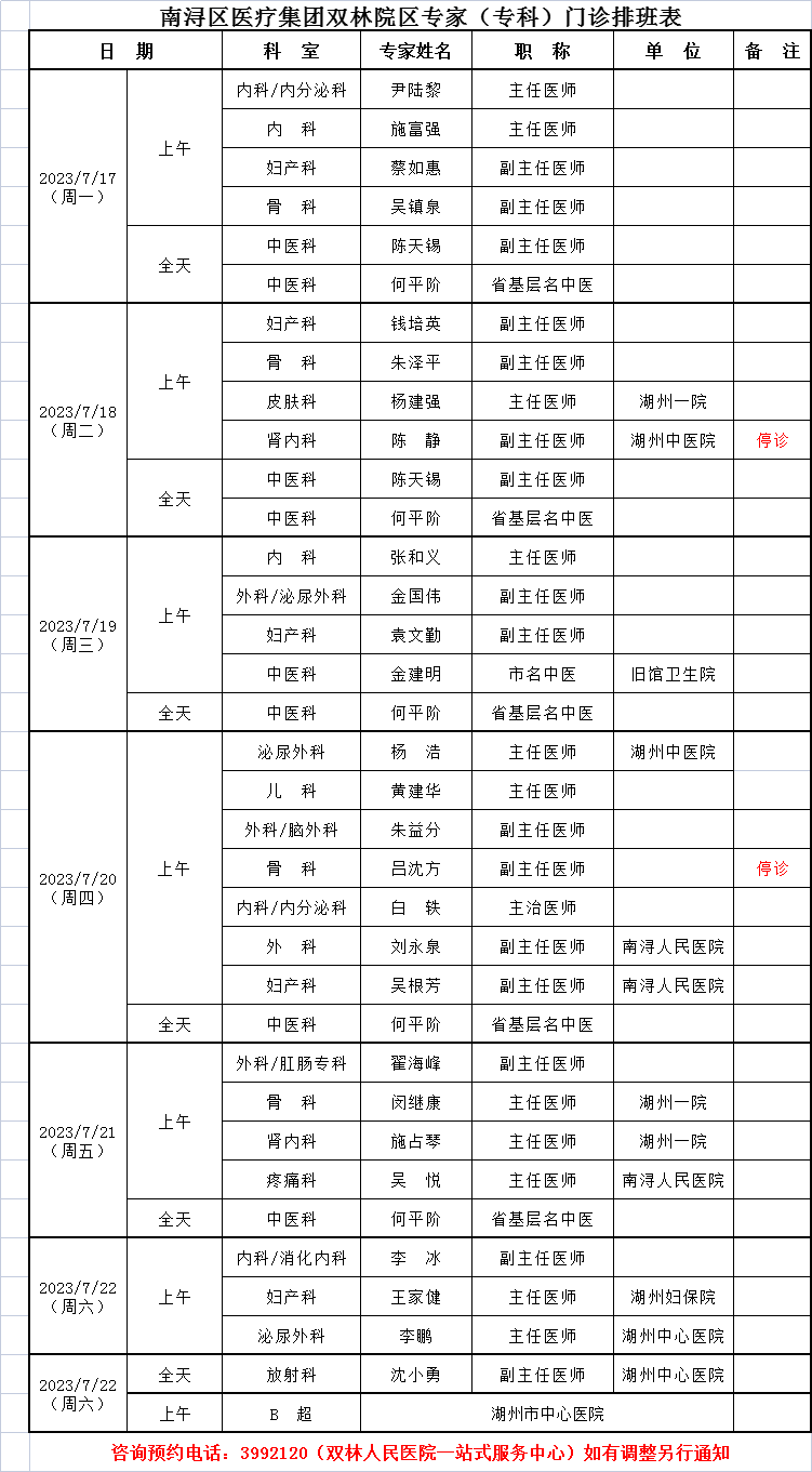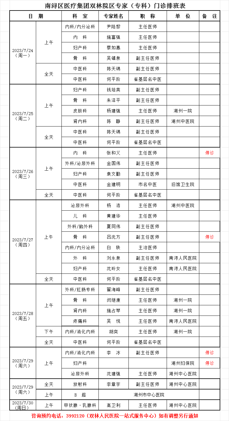双林人民院区专家排班7.17-7.23