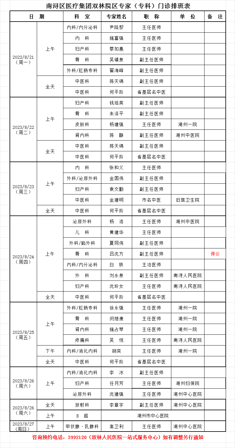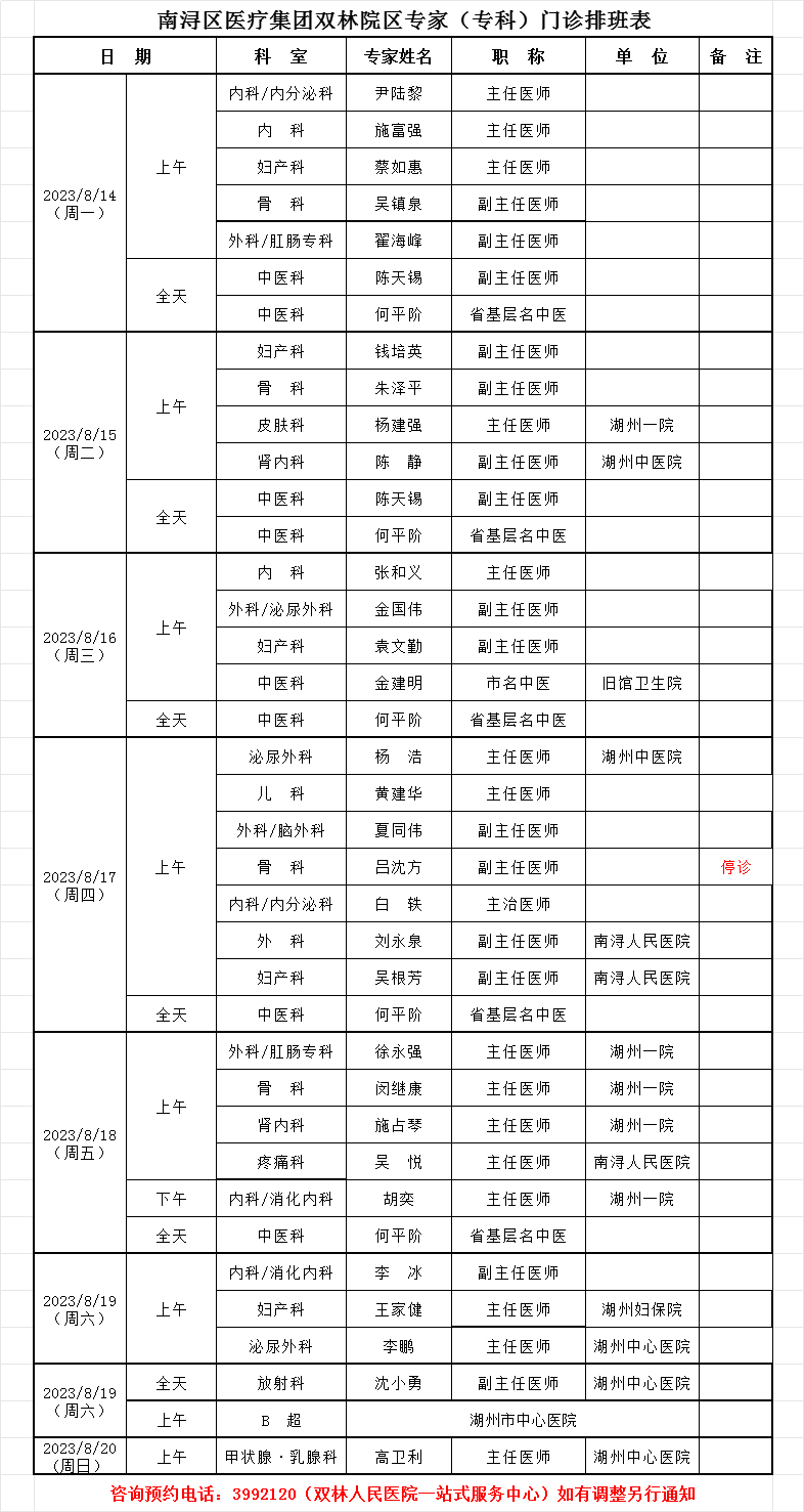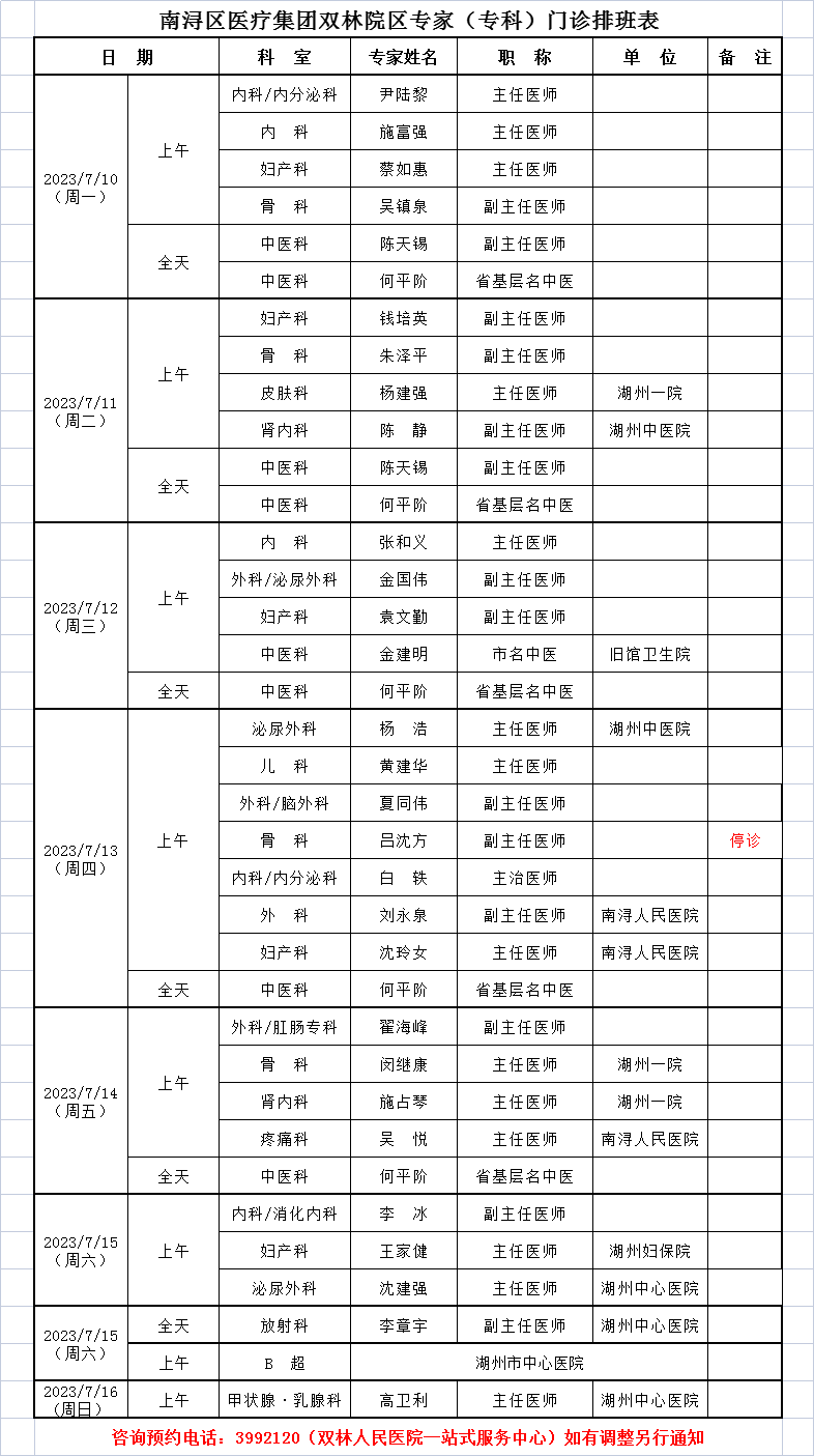 双林人民院区专家排班7.17-7.23
