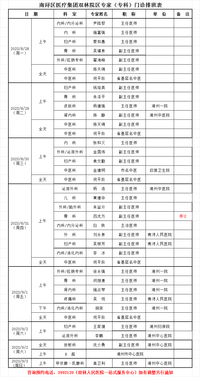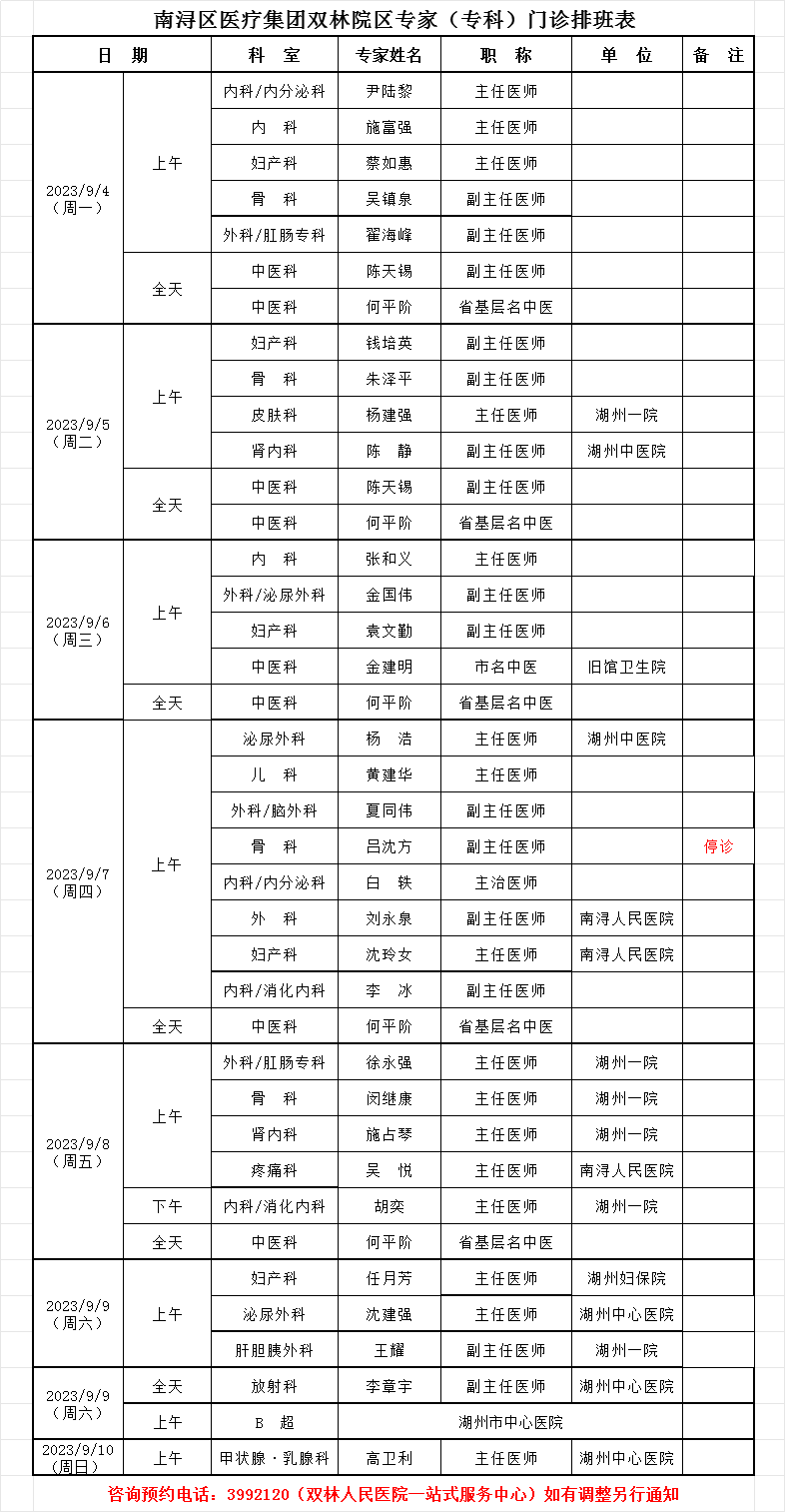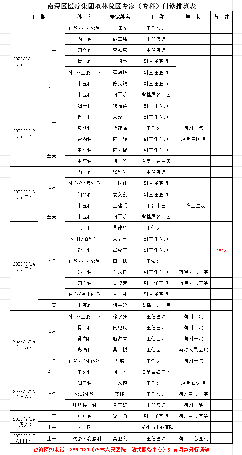 双林人民院区专家排班9.11-9.17