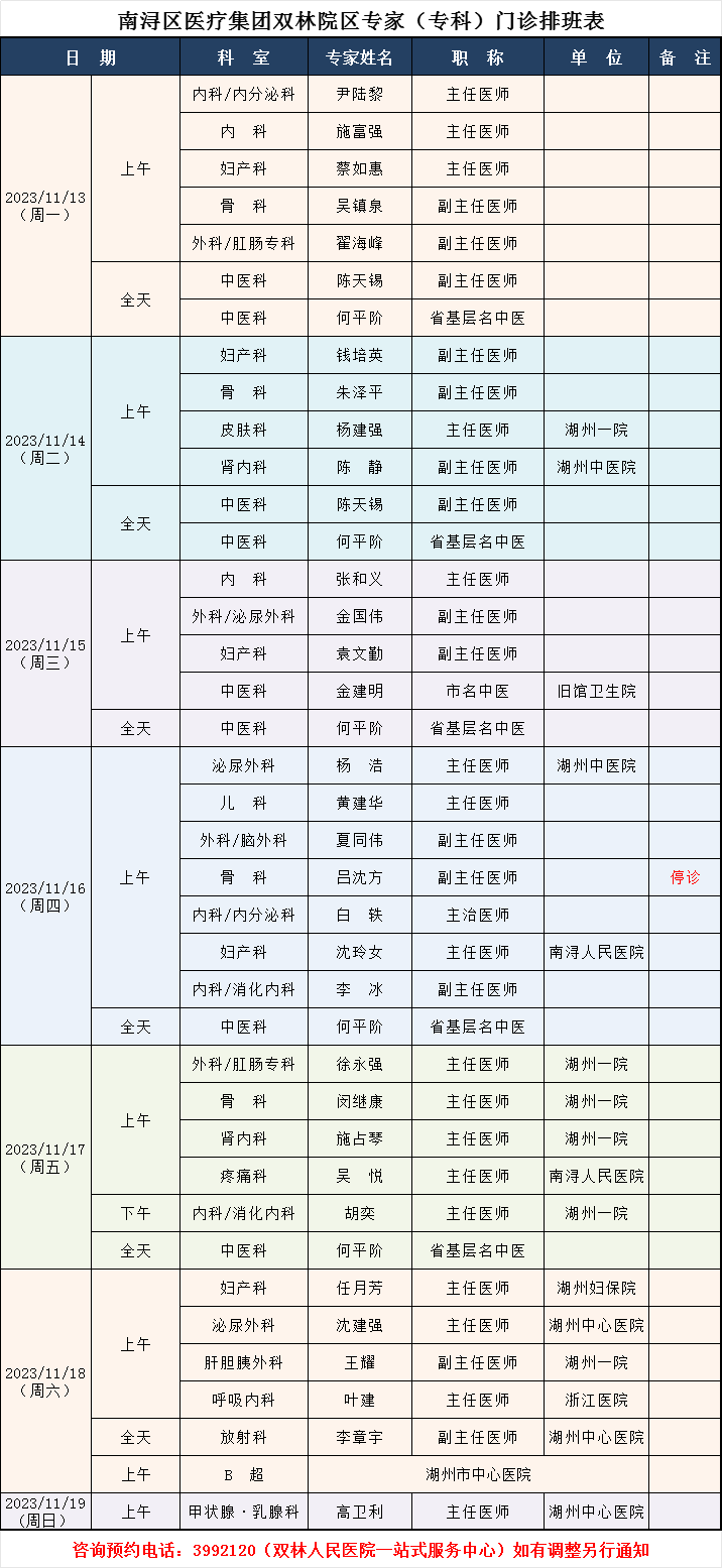双林人民院区专家排班11.13-11..19