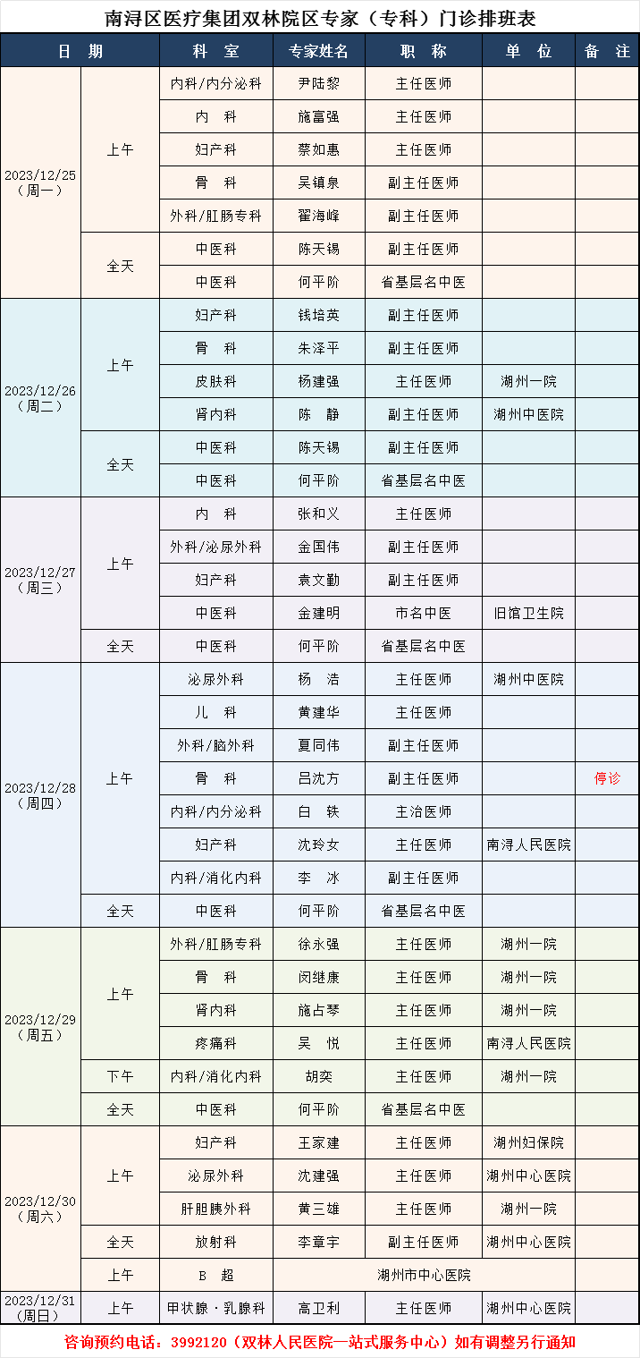 双林人民医院专家排班12.25-12.31