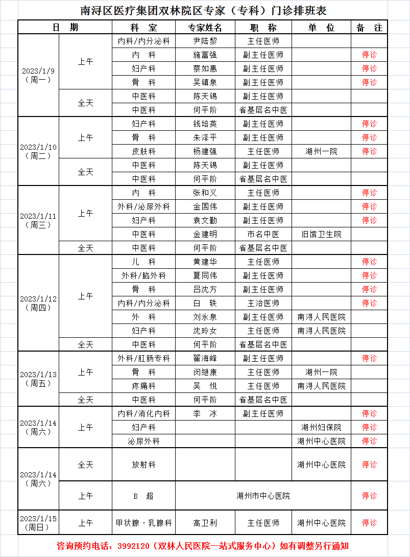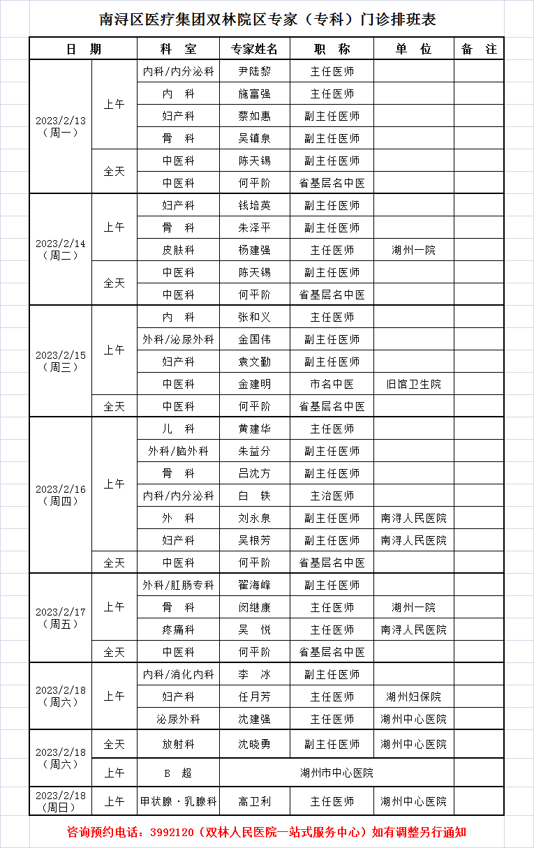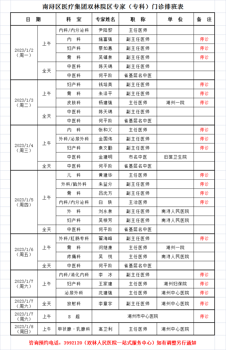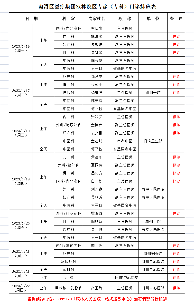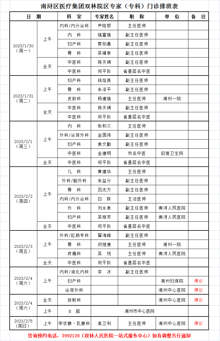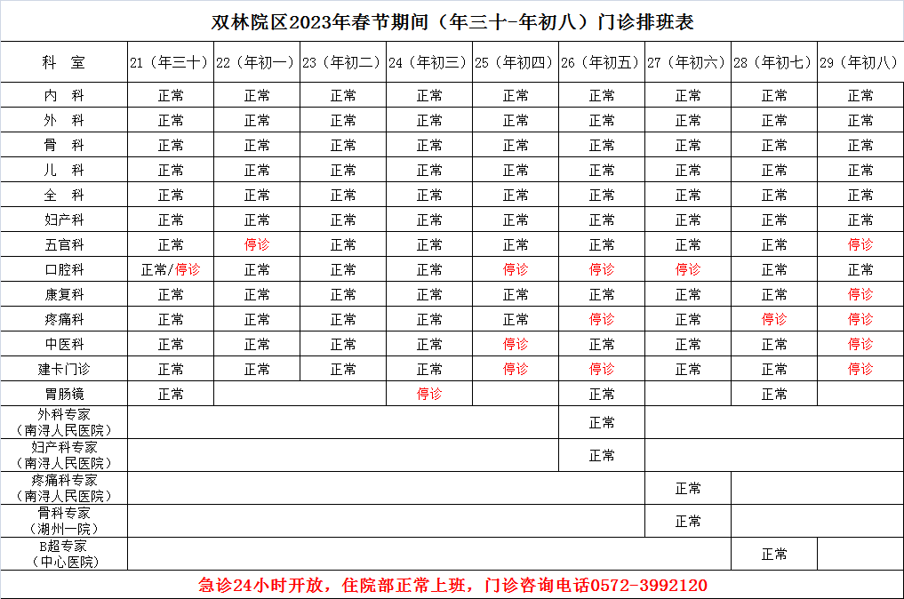 双林医院2023年春节排班2023-1-21/2023-1-29