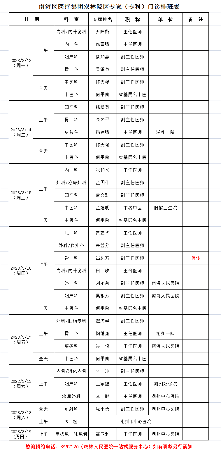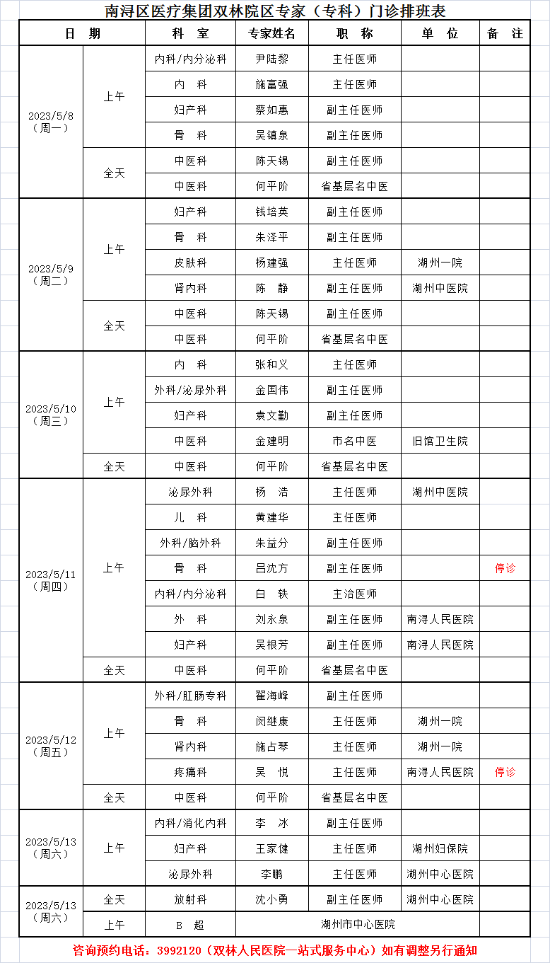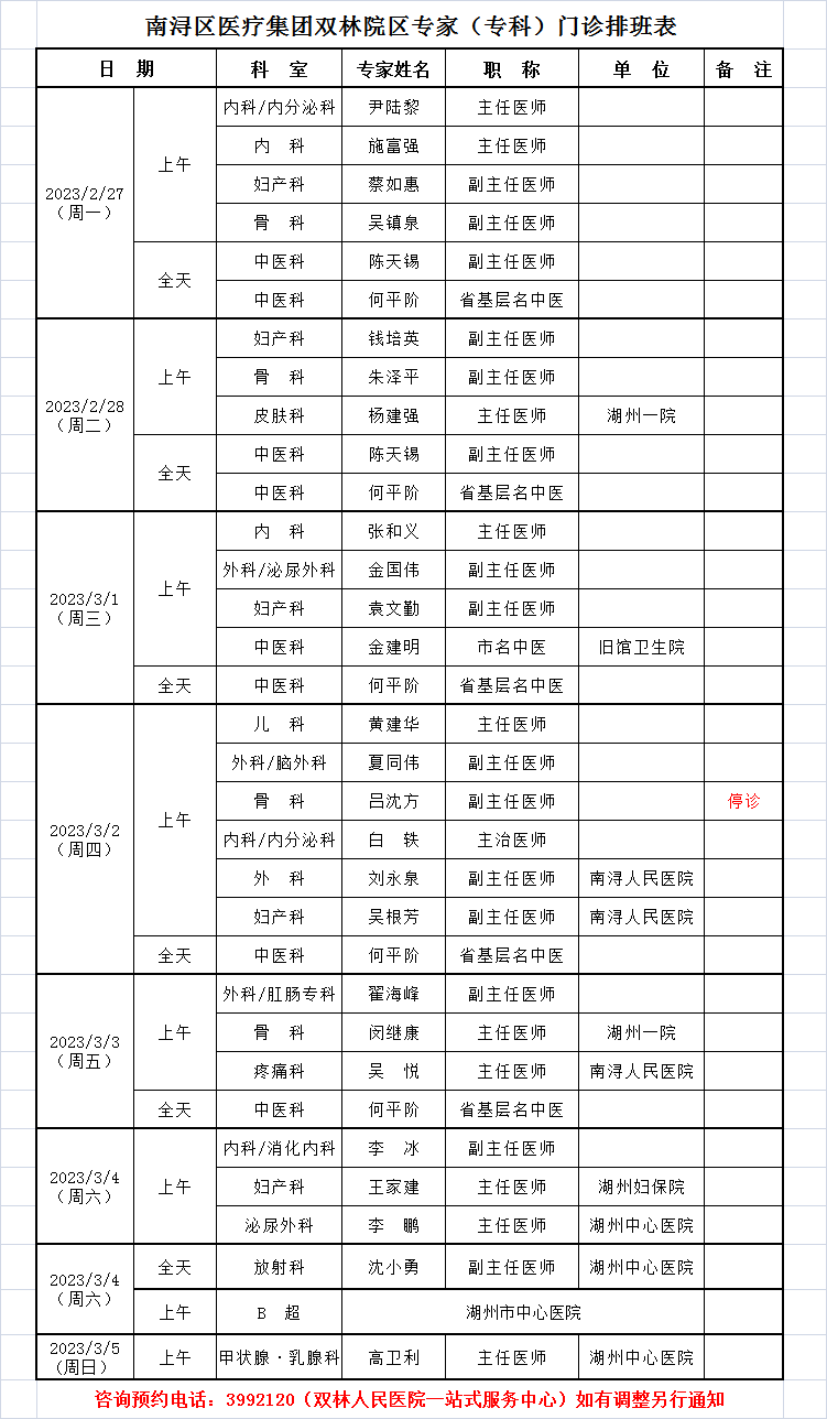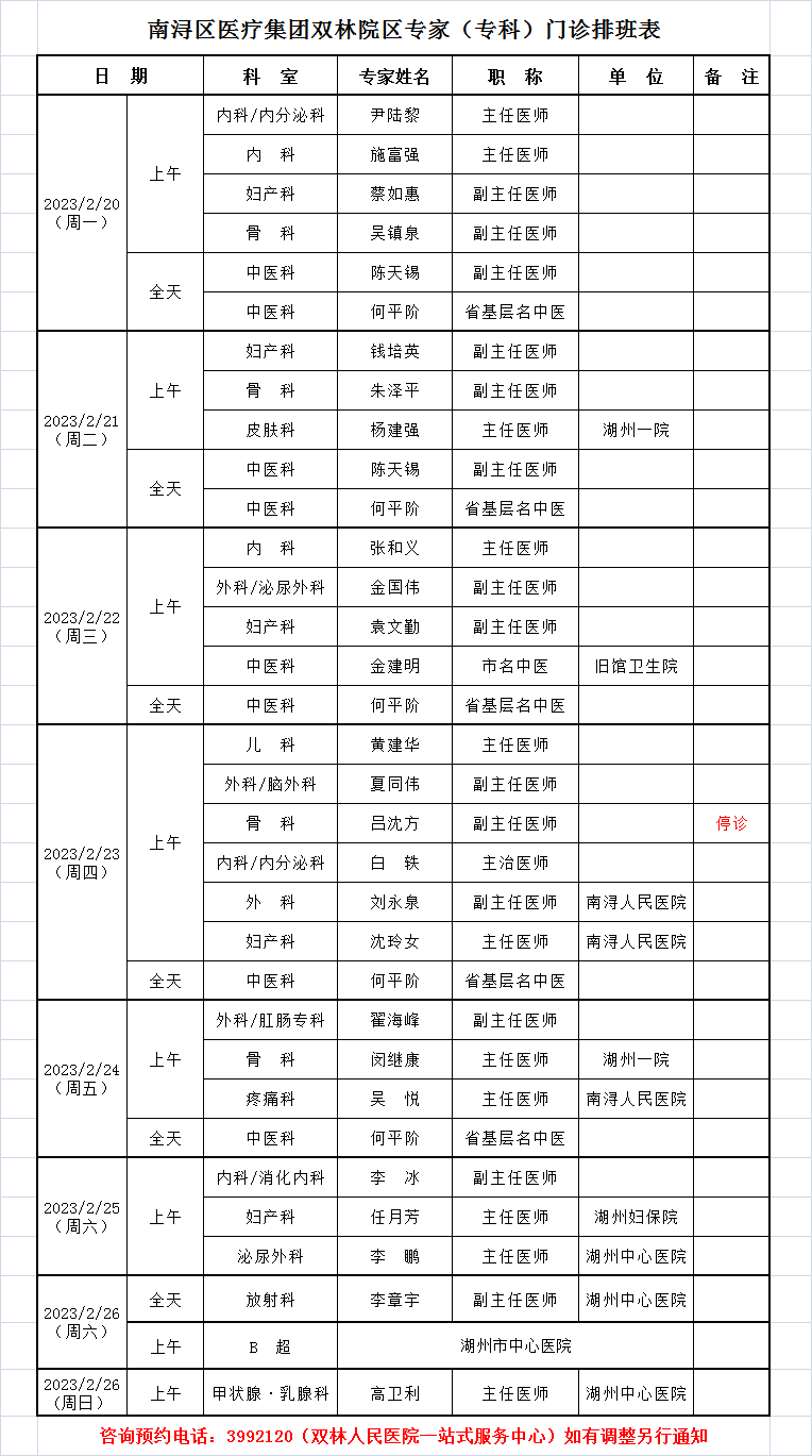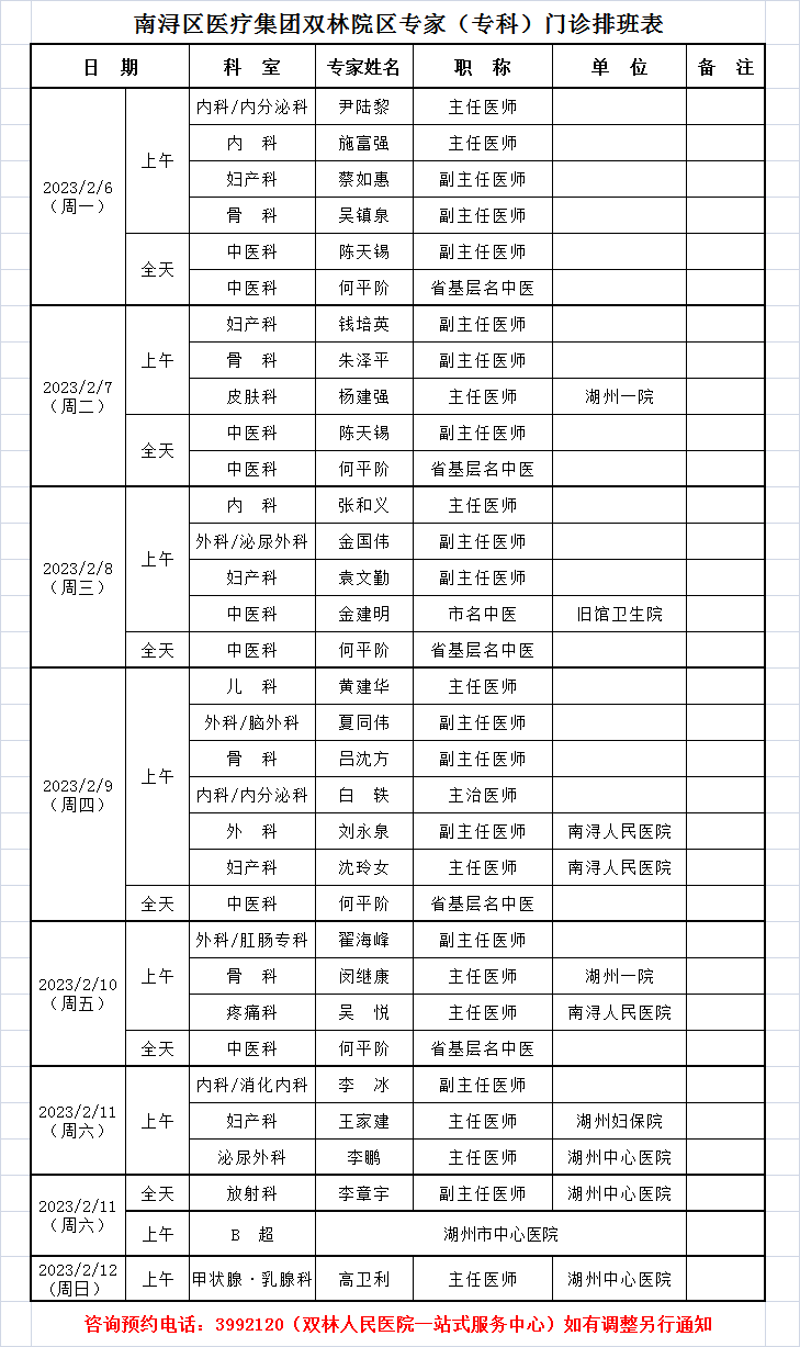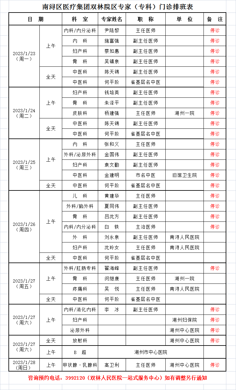 双林医院2023年春节排班2023-1-21/2023-1-29