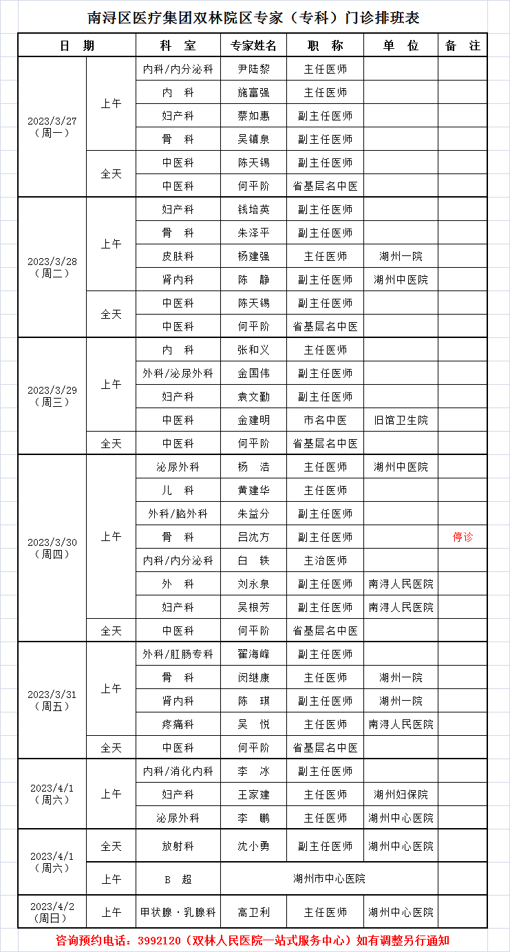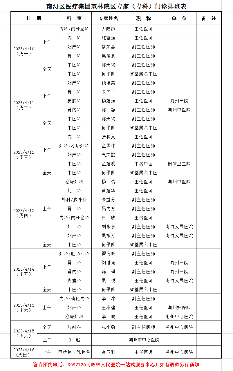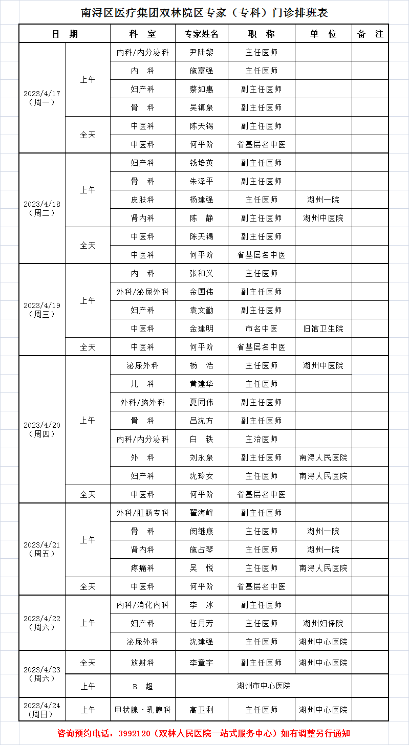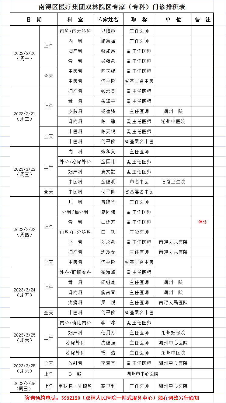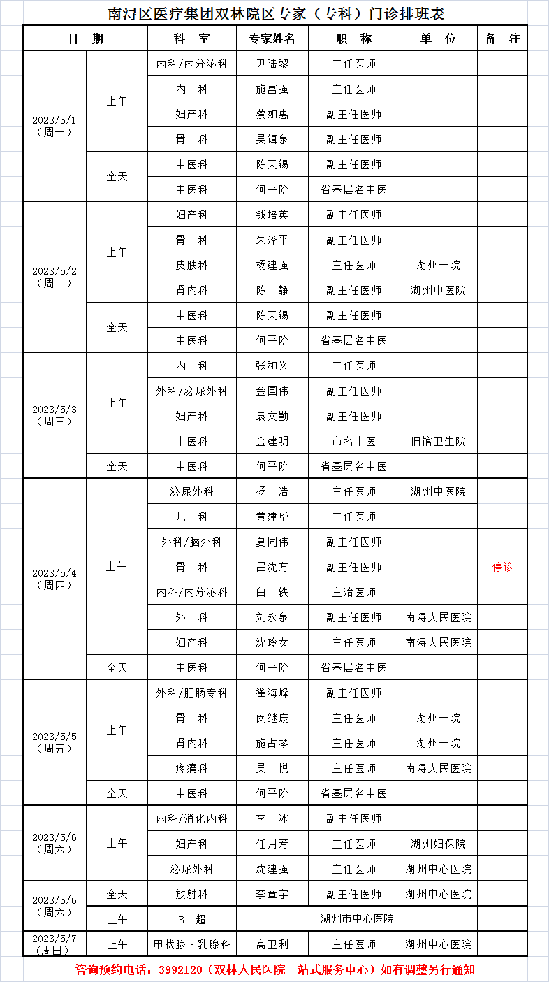 双林医院2023年春节排班2023-1-21/2023-1-29