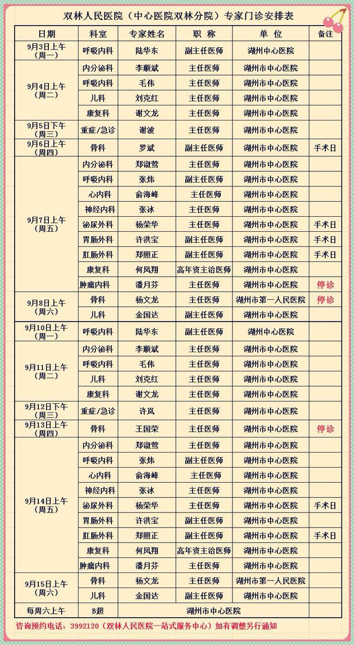 双林医院专家排班2018年9月3日-9月15日