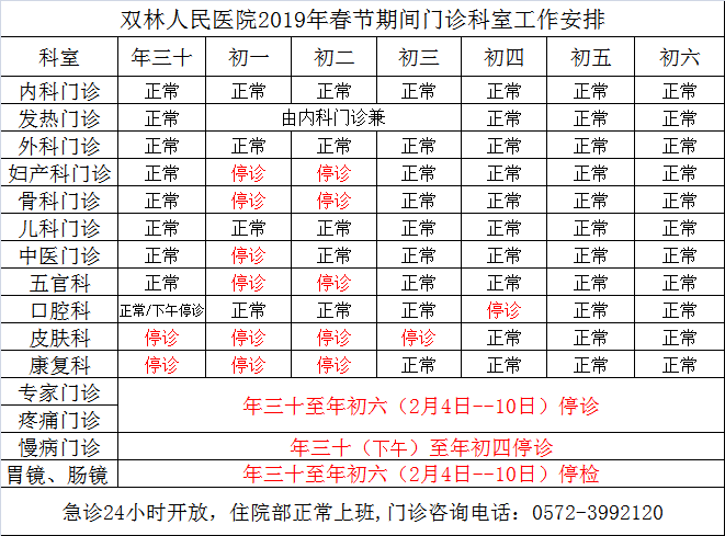 2019年双林医院春节期间门诊排班