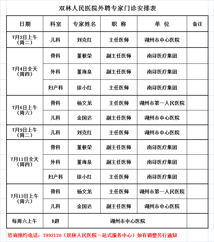 双林院区外聘专家排班2019/7/1-2019/7/15