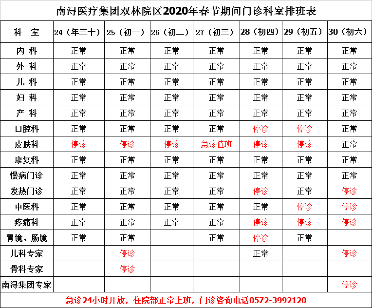 南浔医疗集团双林院区2020年春节期间门诊排班表