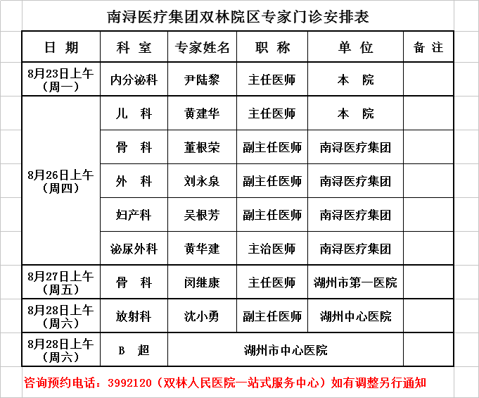 双林医院专家排班2021-8-23/2021-8-29