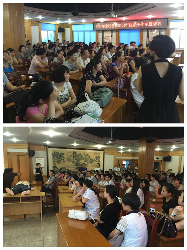 为使全院职工包括医疗、行政、后勤人员熟悉徒手心肺复苏操作要领,掌握院外急救技能,医院制定了全员心肺复苏操作培训考核方案,成立由院领导担任组长的考核小组。整个培训考核活动历时半个月。7月12日,区红十字会救护培训高级讲师张丽玲护士长对全院职工开展统一集中培训、操作示教。7月15日,由各科室选派业务骨干进行操作强化培训,现场考核合格后由业务骨干对科室内人员进行操作二次培训。7月底,医院邀请五名护士长为考官,对临床医疗护理人员、医技(药剂)人员、行政后勤人员分三天逐一进行操作考核,严格把握评分标准。医院领导身先士卒,参与操作并通过考核,在全院掀起了强化学习徒手心肺复苏技术的高潮。