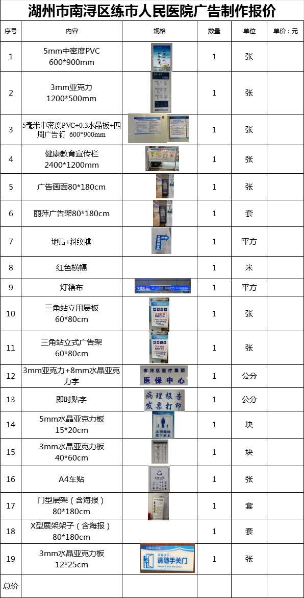 按照湖州市南浔区练市人民医院采购计划及相关规定,针对医院常用的广告制作(标识标牌,宣传品、宣传资料制作等)采购项目进行院内公开遴选,请符合条件的产品供应商积极参与报名。