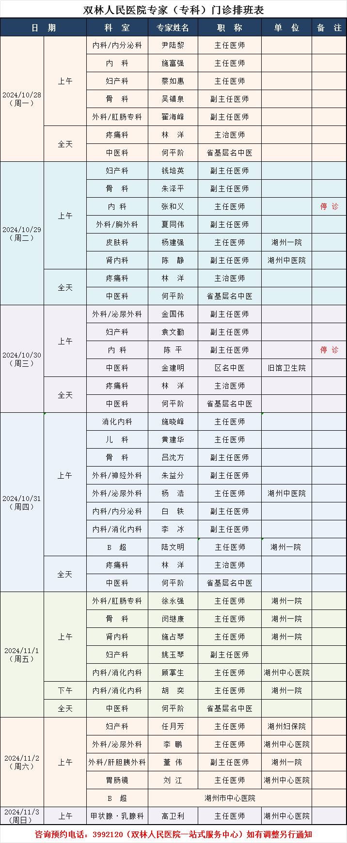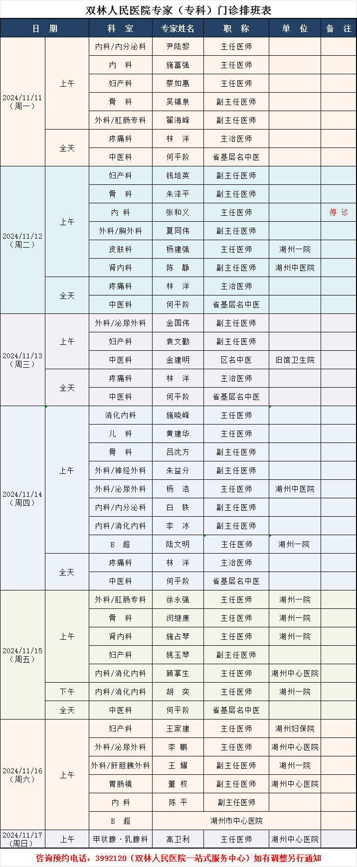 双林人民医院专家排班11.4-11.9