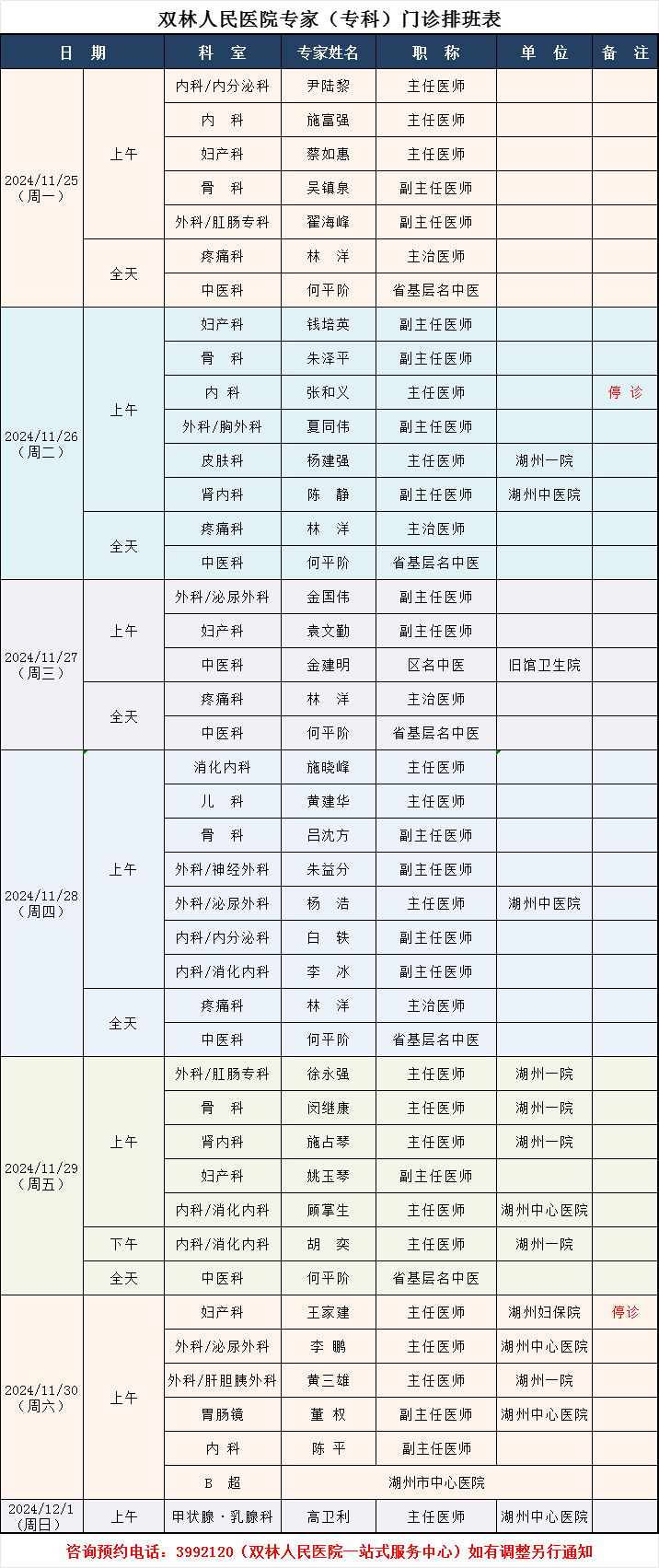 双林人民医院专家排班11.25-12.1