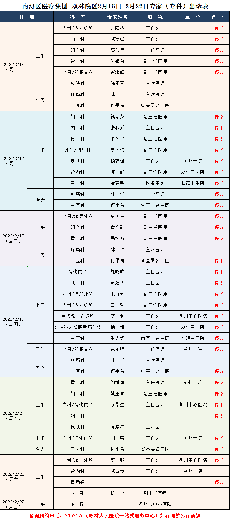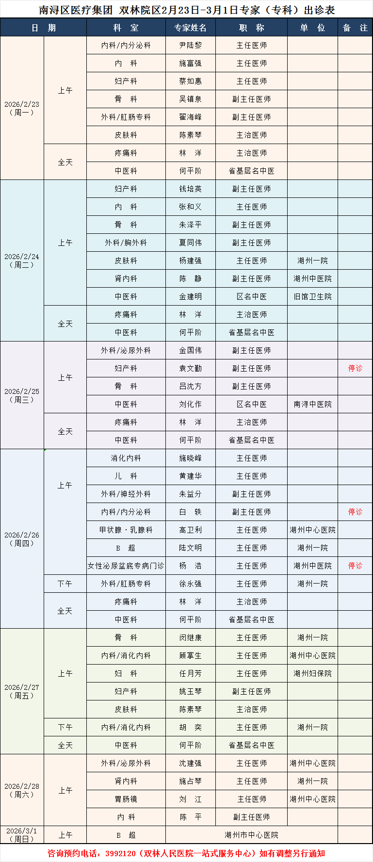 双林人民医院专家排班2.23-3.1