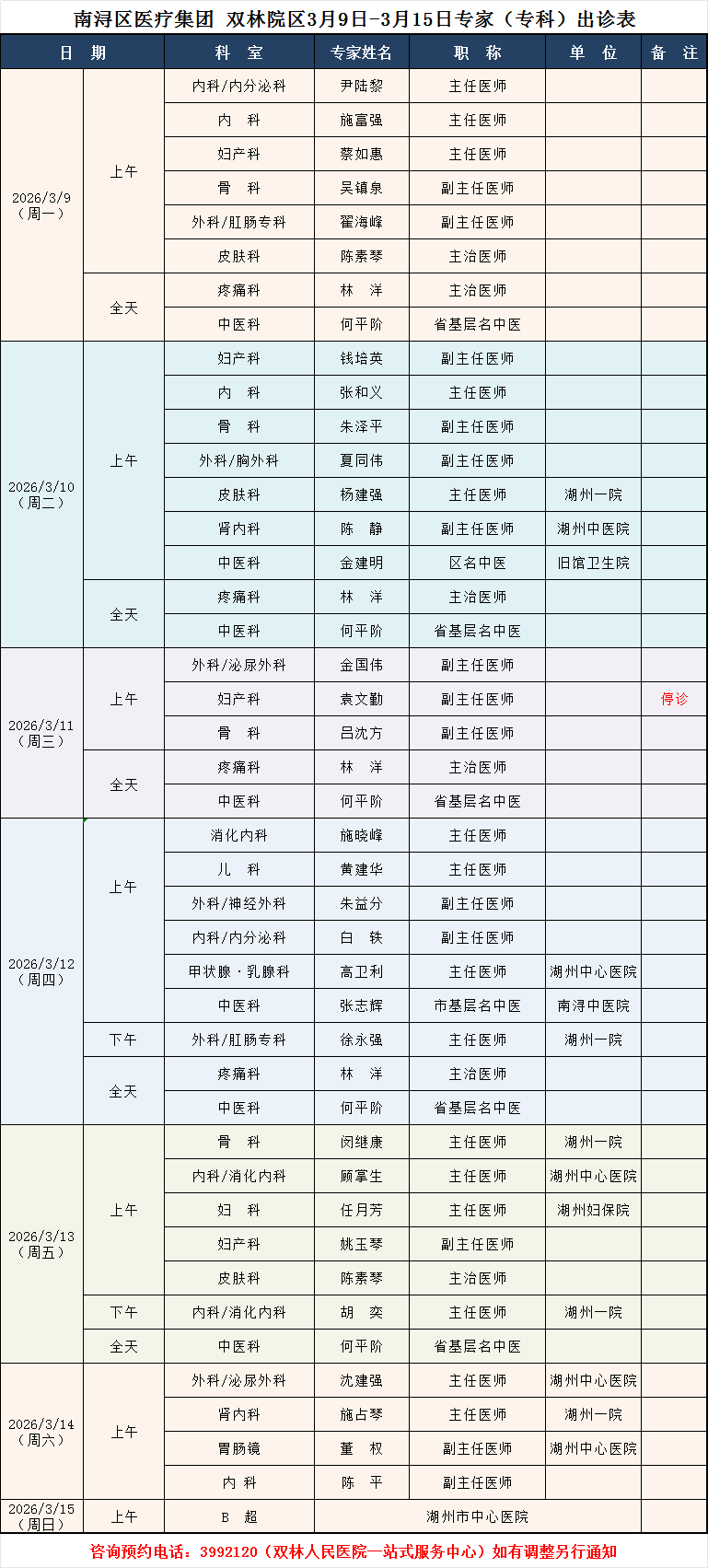 双林人民医院专家排班3.9-3.15