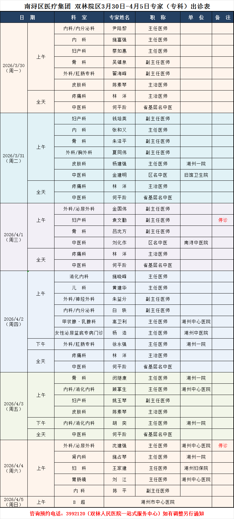 双林人民医院专家排班3.30-4.5