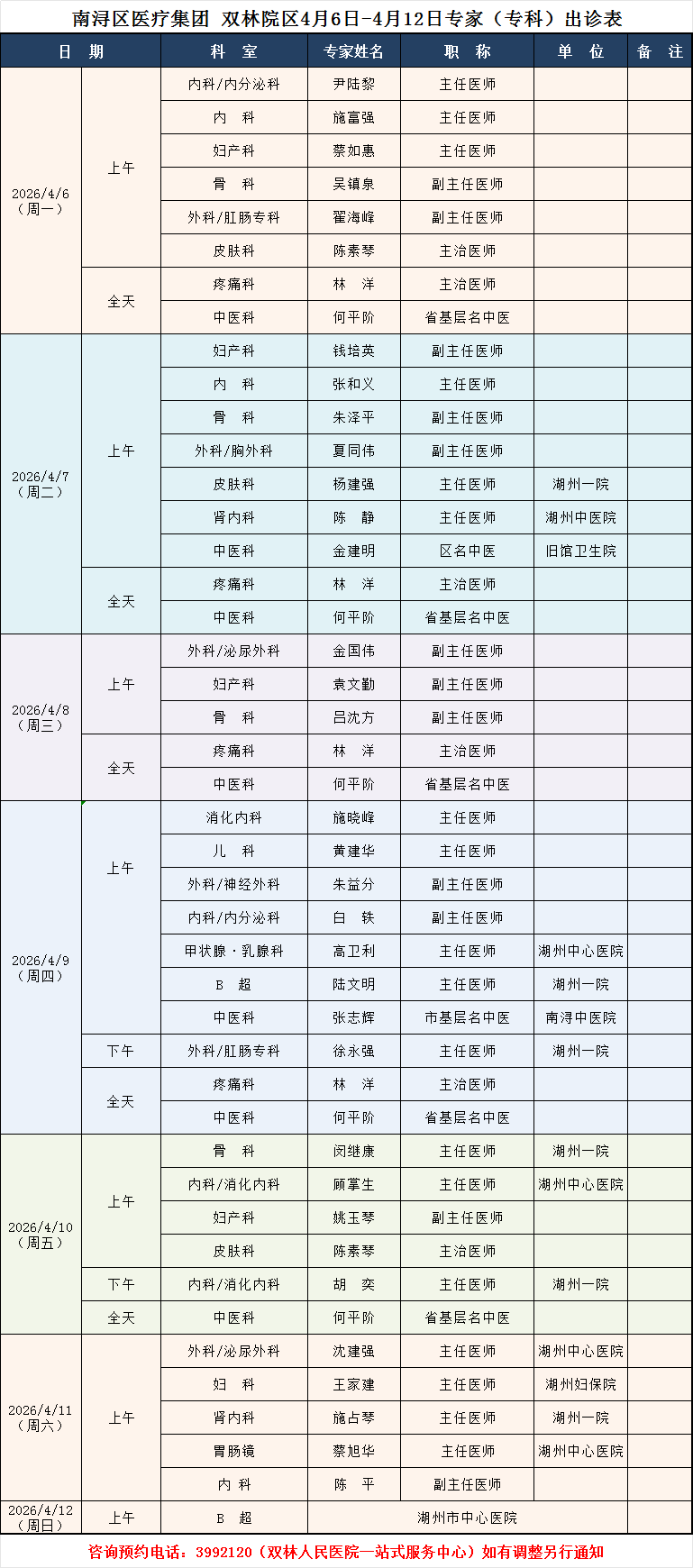 双林人民医院专家排班4.6-4.12