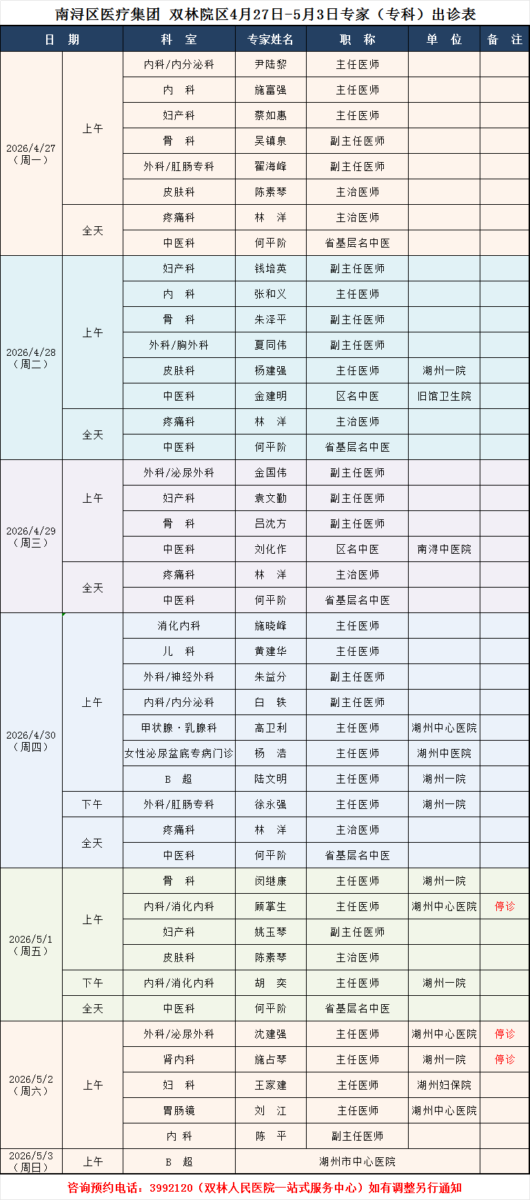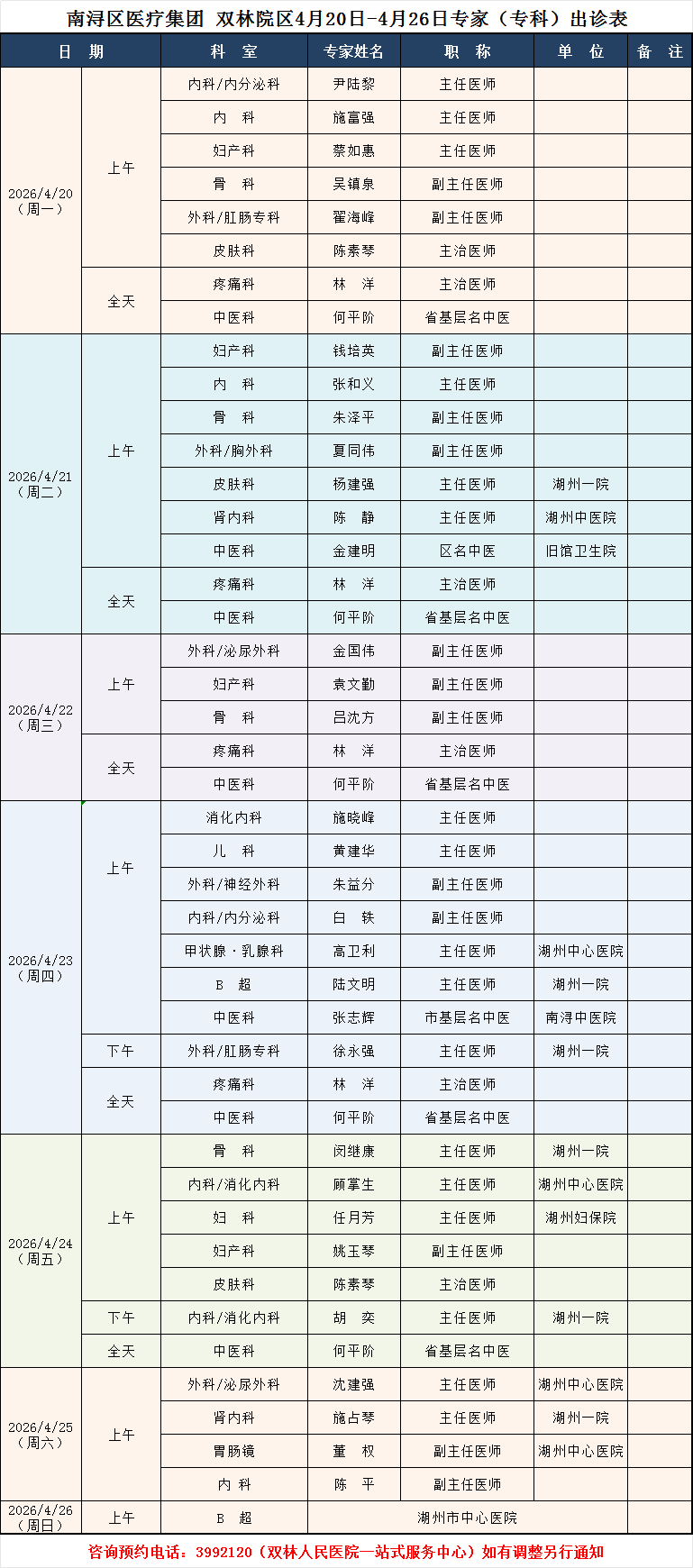 双林人民医院专家排班4.27-5.3