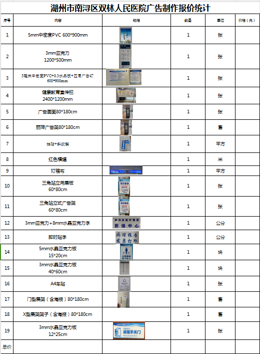 按照湖州市南浔区双林人民医院采购计划及相关规定,针对医院常用的广告制作(标识标牌,宣传品、宣传资料制作等)采购项目进行院内公开遴选,请符合条件的产品供应商积极参与报名。
