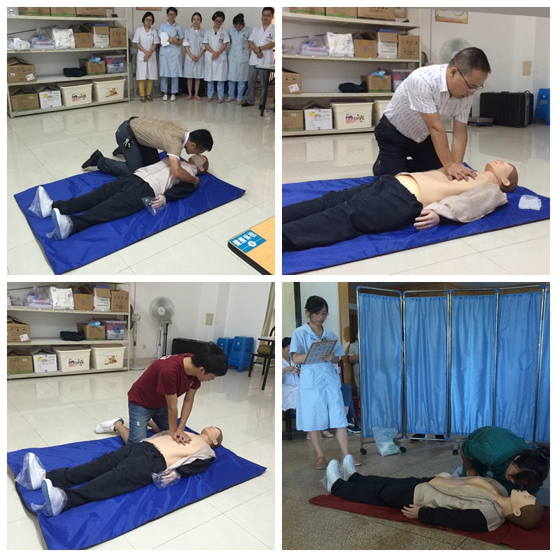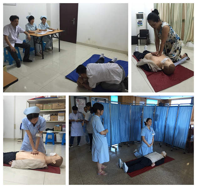 为使全院职工包括医疗、行政、后勤人员熟悉徒手心肺复苏操作要领,掌握院外急救技能,医院制定了全员心肺复苏操作培训考核方案,成立由院领导担任组长的考核小组。整个培训考核活动历时半个月。7月12日,区红十字会救护培训高级讲师张丽玲护士长对全院职工开展统一集中培训、操作示教。7月15日,由各科室选派业务骨干进行操作强化培训,现场考核合格后由业务骨干对科室内人员进行操作二次培训。7月底,医院邀请五名护士长为考官,对临床医疗护理人员、医技(药剂)人员、行政后勤人员分三天逐一进行操作考核,严格把握评分标准。医院领导身先士卒,参与操作并通过考核,在全院掀起了强化学习徒手心肺复苏技术的高潮。